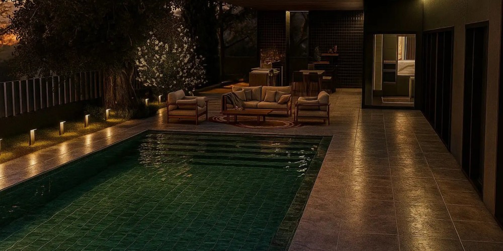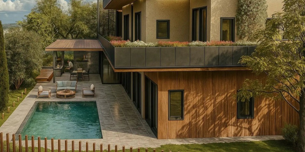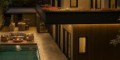 Проект включает три уровня, соединённых лифтом. Пространства спроектированы с учётом естественного освещения, функциональности и свободного перемещения между внутренней и внешней зонами. На первом этаже располагается мастер-спальня с прямым выходом в сад и к бассейну, кухня открытого типа, гостиная, кабинет, тренажёрный зал, кладовая и отдельная хозяйственная кухня.