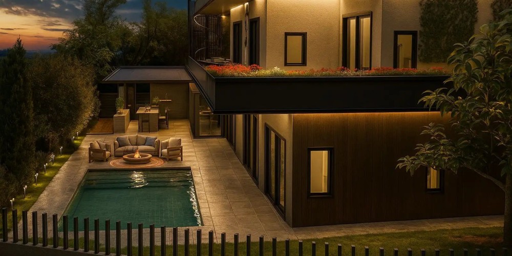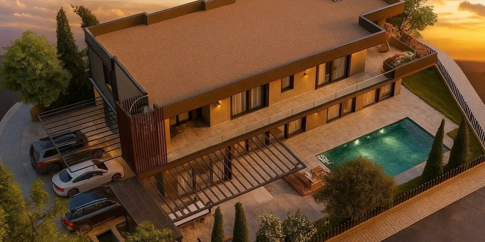 Вилла занимает угловой участок, который граничит с пешеходной дорожкой, общественной зелёной зоной и тупиковой улицей — это гарантирует минимальный уровень движения и ощущение уединения. При этом объект находится в шаговой доступности от всей необходимой инфраструктуры: пляжа, супермаркетов, школ и других удобств.