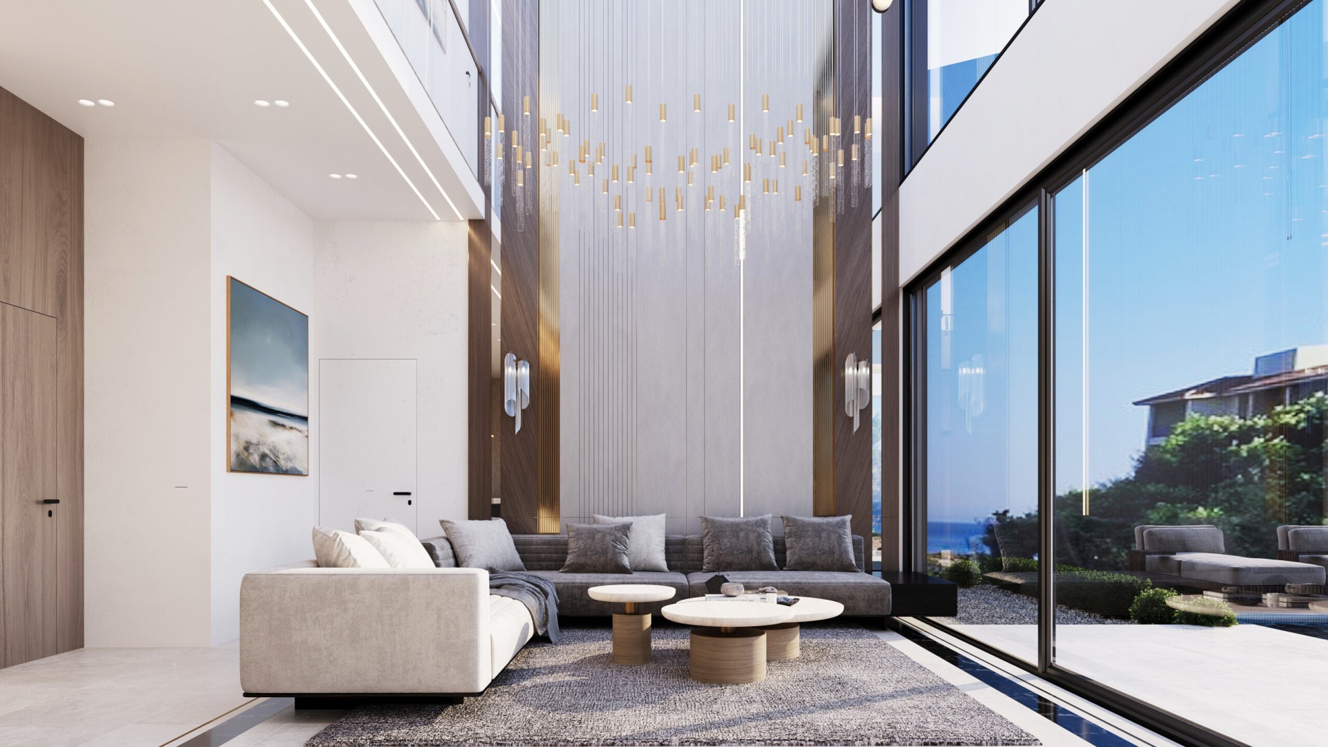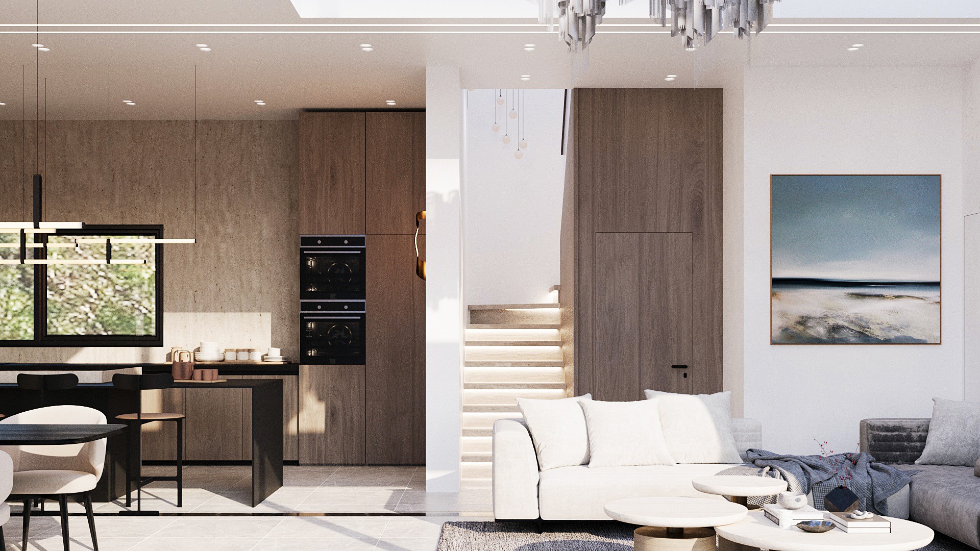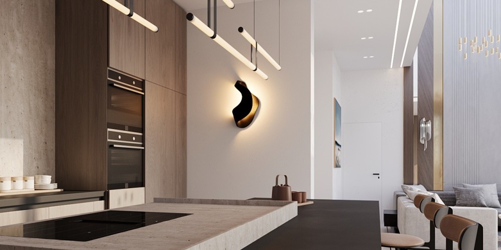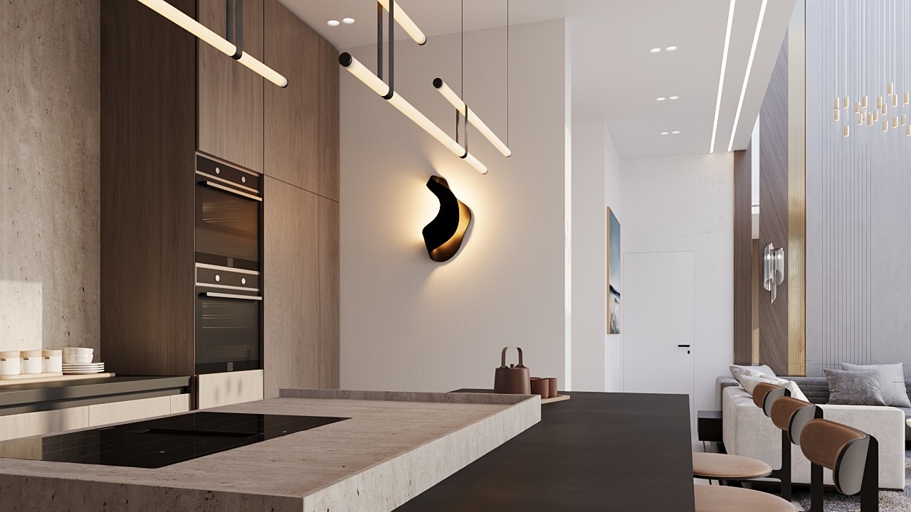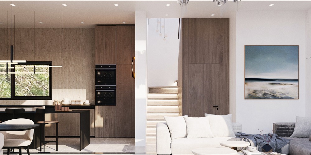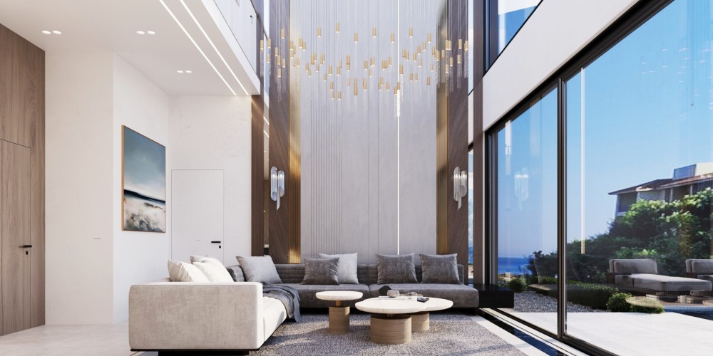 Вилла имеет крытую площадь 204 кв. м и отличается продуманными пропорциями, а также высокими потолками по всему первому этажу. Гостиная зона подчеркнута эффектным потолком двойной высоты, создающим ощущение простора и наполненности светом. Открытая планировка гостиной и кухни выполнена с элегантной отделкой и ориентирована на повседневный комфорт.