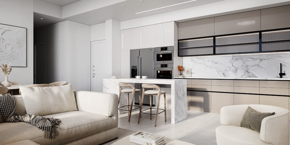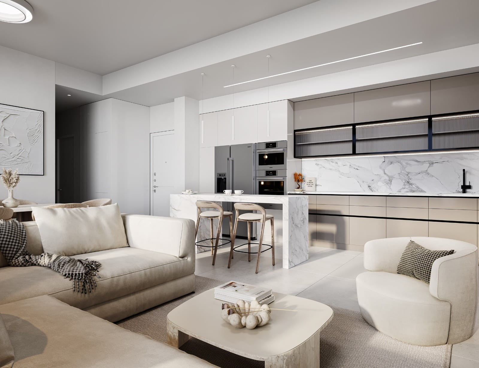 Каждая резиденция отличается просторной гостиной открытой планировки и встроенными системами хранения, дополненными высококачественной кухонной мебелью и мебелью для ванных комнат. Здание выделяется элегантной входной группой, мраморной отделкой лобби и фасада, современным лифтом и передовыми системами безопасности, создающими приватную и хорошо организованную жилую среду.