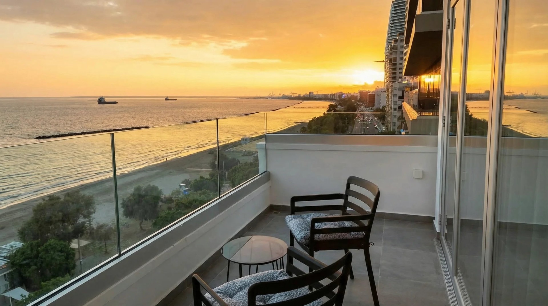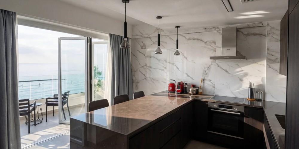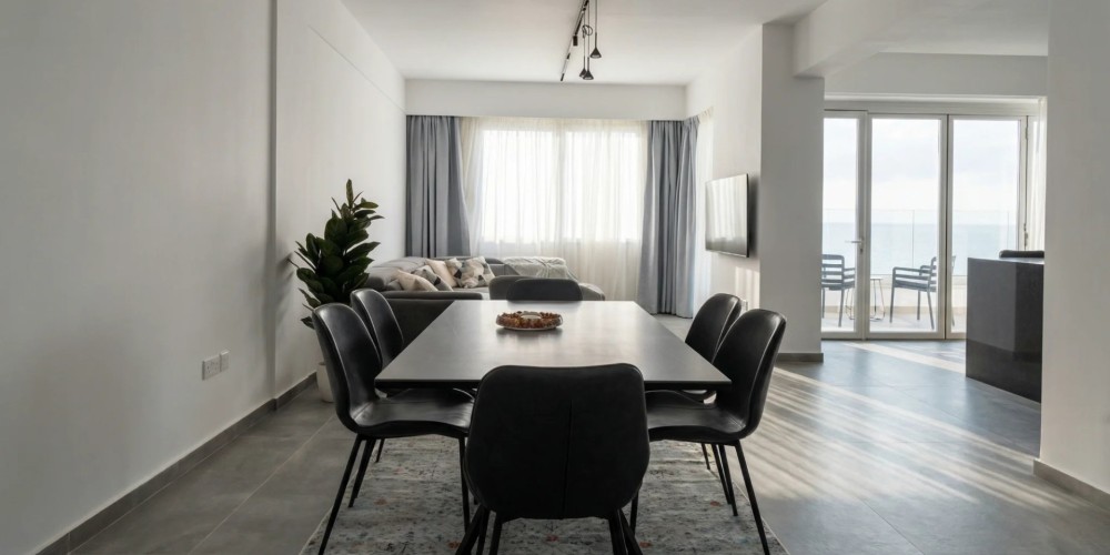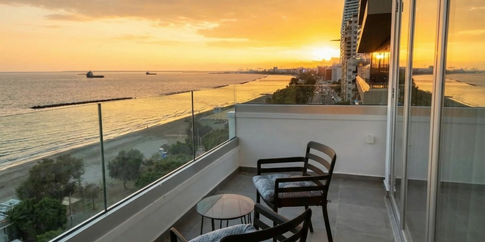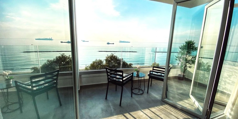 Апартаменты расположены на первой береговой линии Лимассола — в одной из наиболее востребованных прибрежных локаций города. На 4-м этаже размещается полностью меблированная квартира площадью 121 м² с закрытой верандой 12 м² и беспрепятственным видом на Средиземное море.