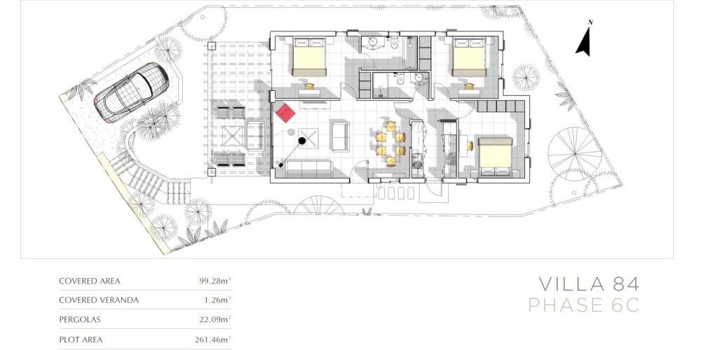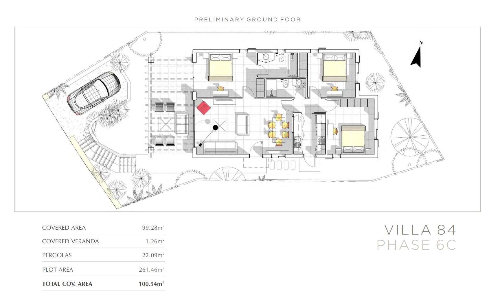 Планировка занимает два этажа: на первом расположены гостиная, столовая и кухня, а также гостевой санузел и выход на террасу. На втором этаже находятся две спальни с двумя санузлами, образующие удобную и хорошо продуманную жилую зону. Собственный частный бассейн входит в состав объекта и придаёт повседневной жизни подлинный курортный характер.