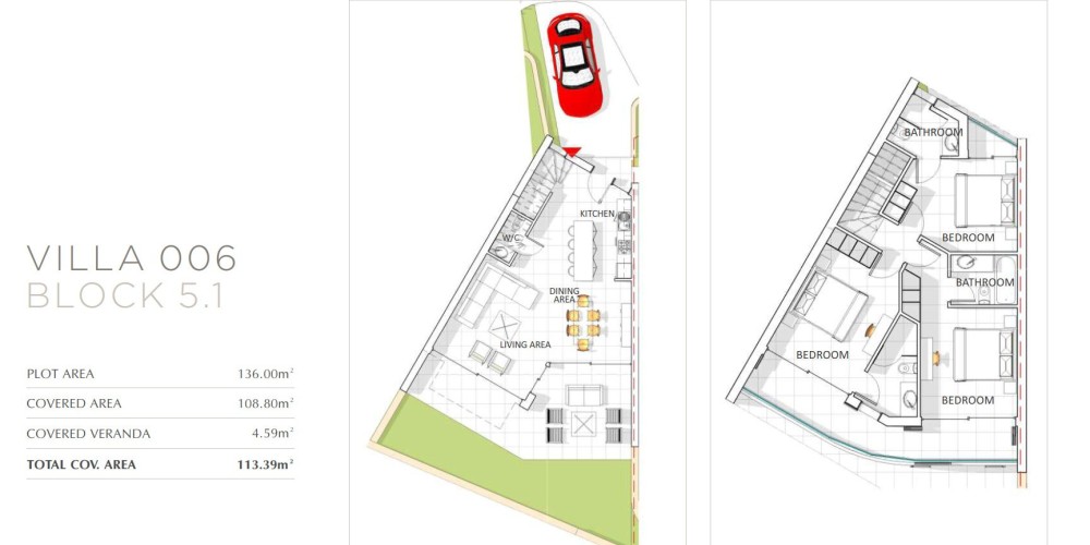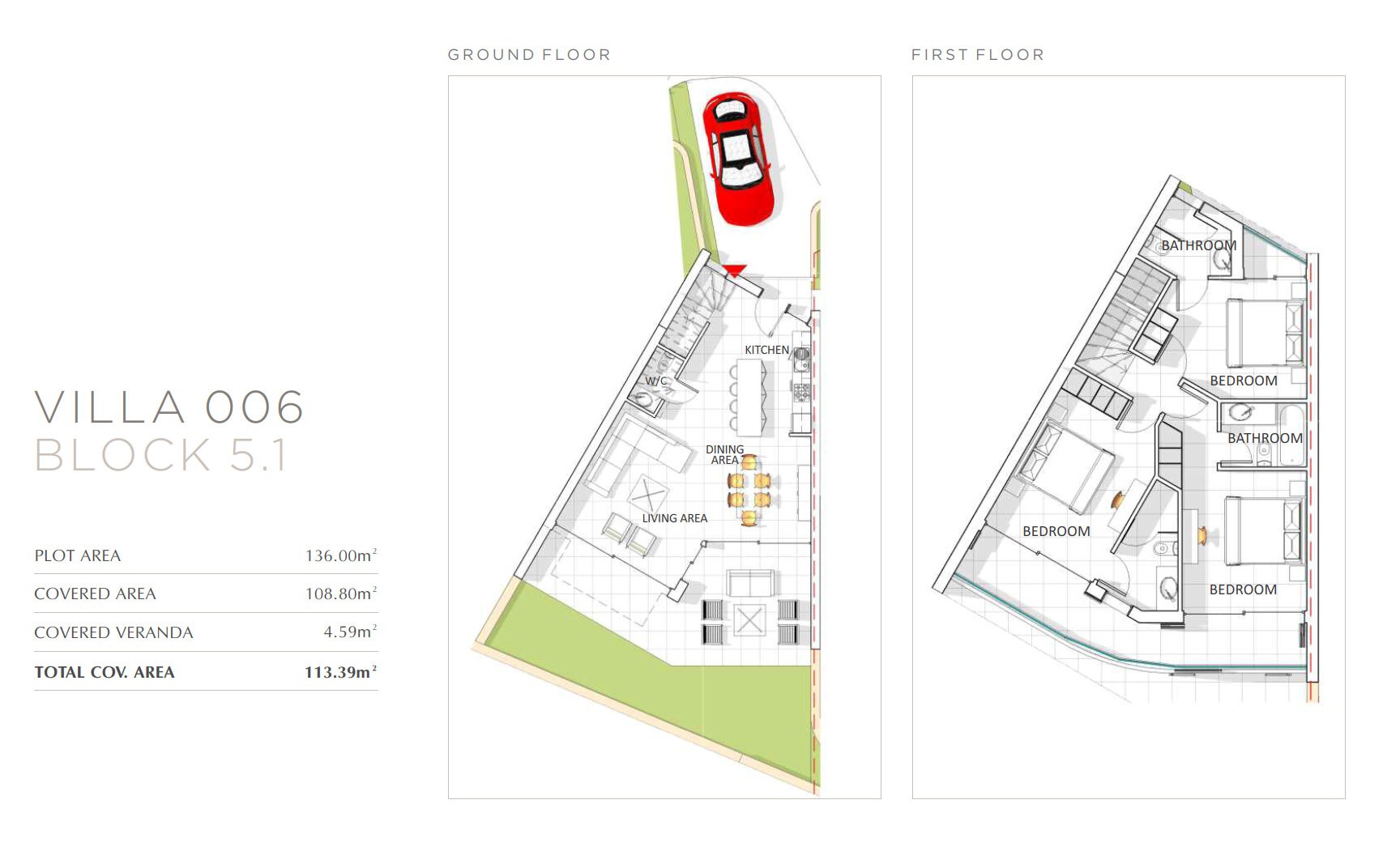 - Площадь участка: 136 м²; крытая площадь: 108,80 м²; общая крытая площадь: 113,39 м²