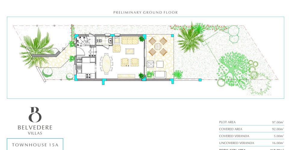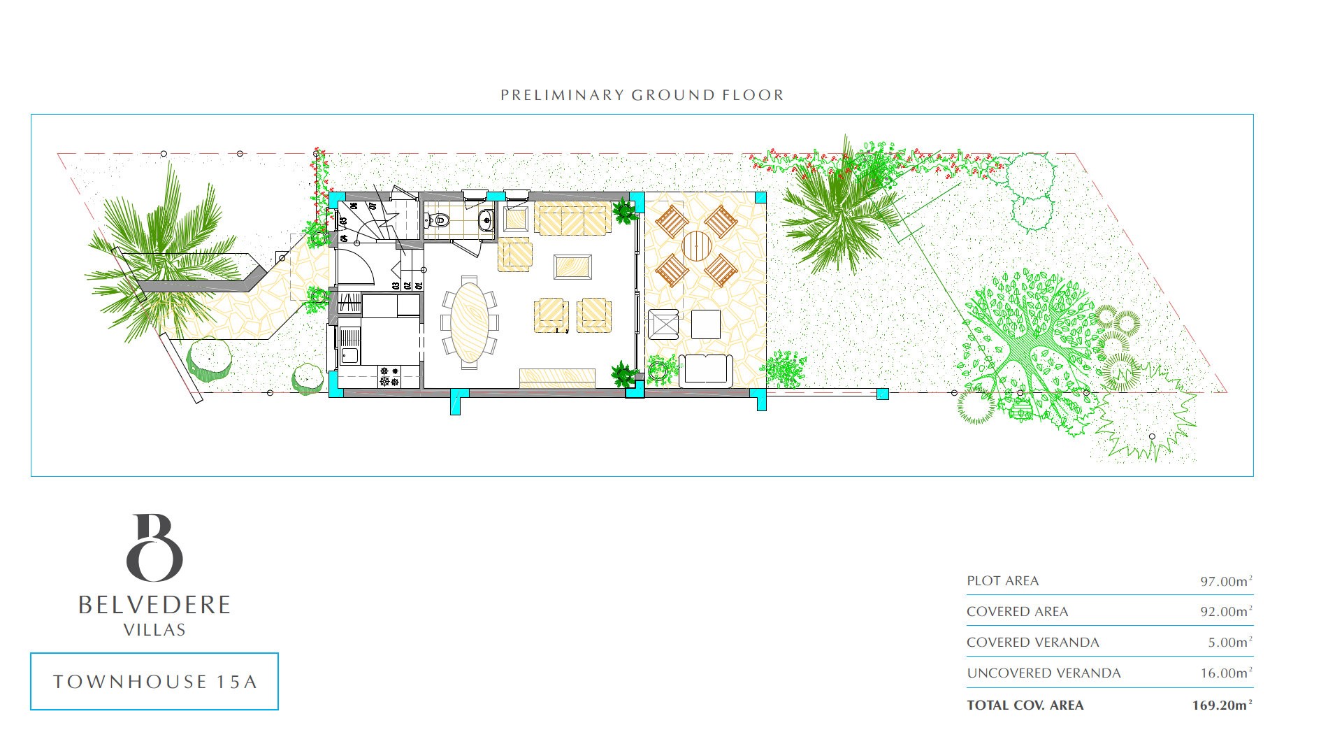 - Площадь участка: 97 м²; крытая площадь: 92 м²; общая крытая площадь: 169,20 м²