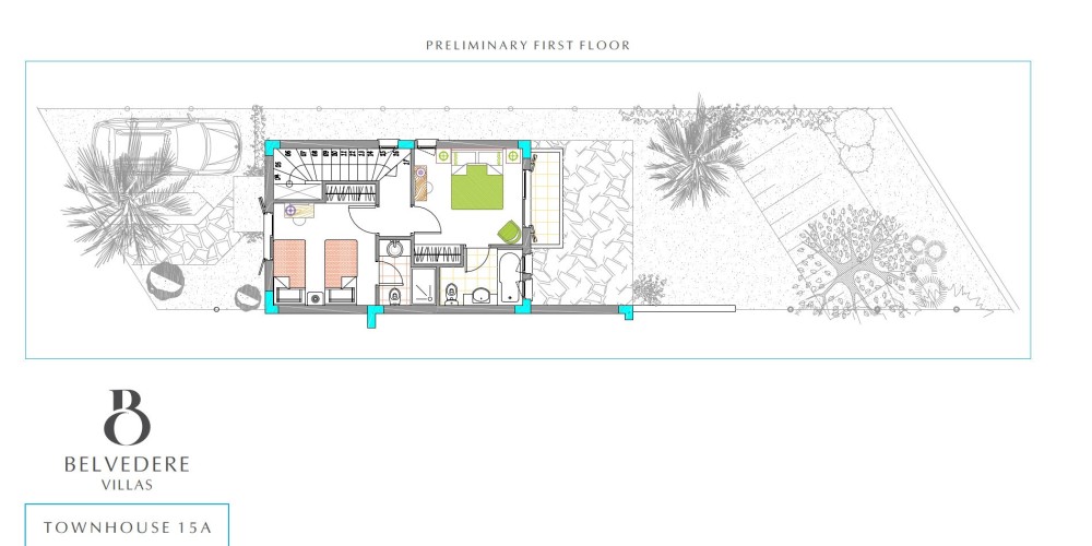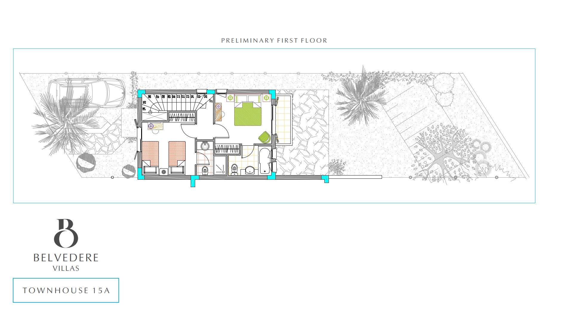 Планировка занимает два этажа: на первом расположены гостиная, столовая и кухня, а также гостевой санузел и выход на террасу. На втором этаже находятся две спальни с двумя санузлами, образующие удобную и хорошо продуманную жилую зону. Собственный частный бассейн входит в состав объекта и придаёт повседневной жизни подлинный курортный характер.