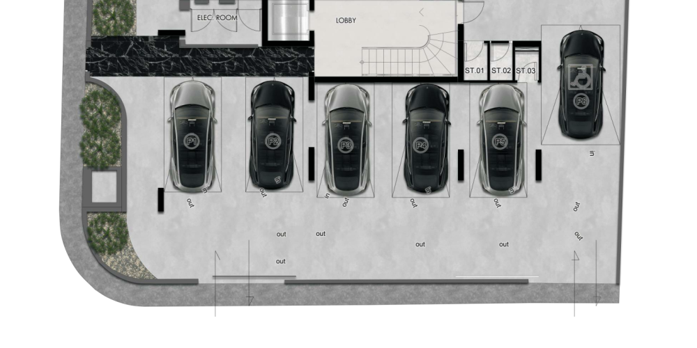Все апартаменты включают крытое парковочное место на цокольном этаже и личную кладовую, доступную из общего холла. Здание оборудовано лифтом. Входная зона выполнена с особым вниманием к деталям: мраморные полы, деревянные панели и дизайнерское освещение создают запоминающееся первое впечатление.