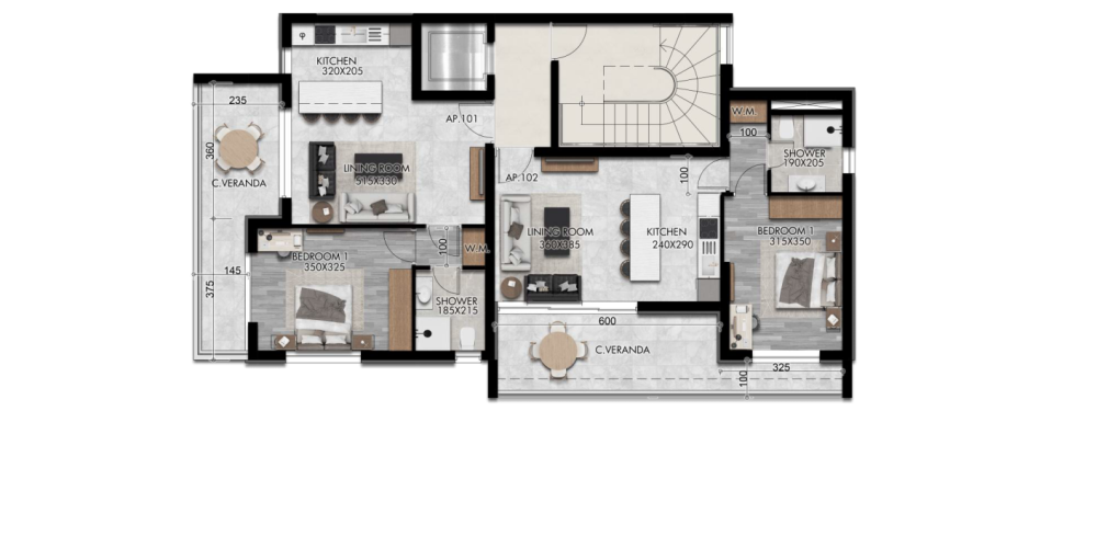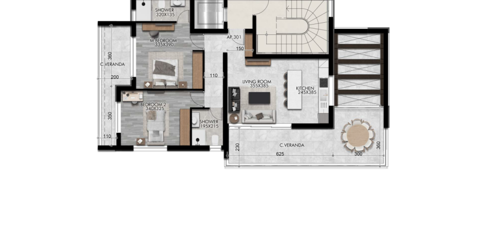 - Апартаменты на 2-м и 3-м этажах: жилая площадь 80 м², крытые веранды 28–29 м²