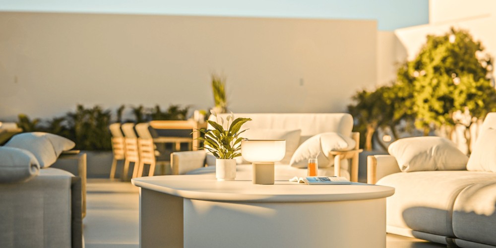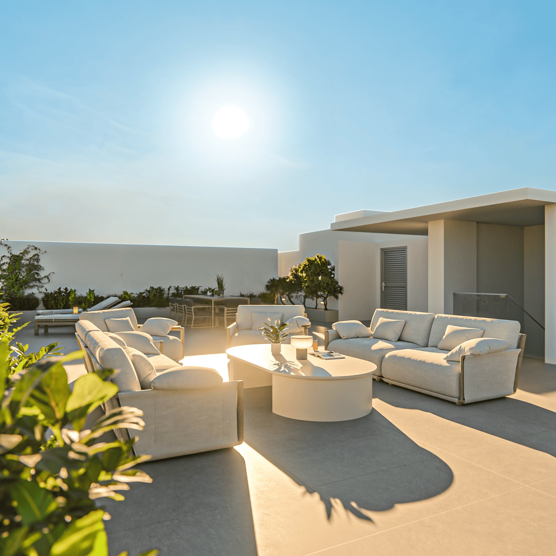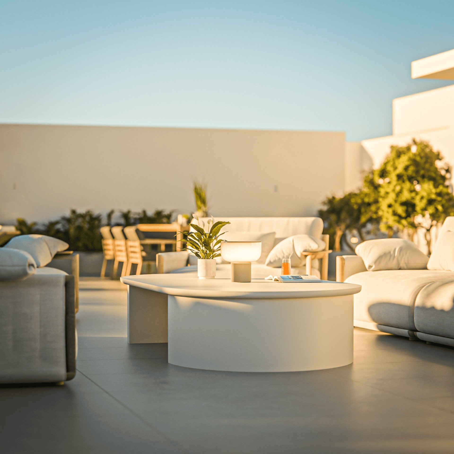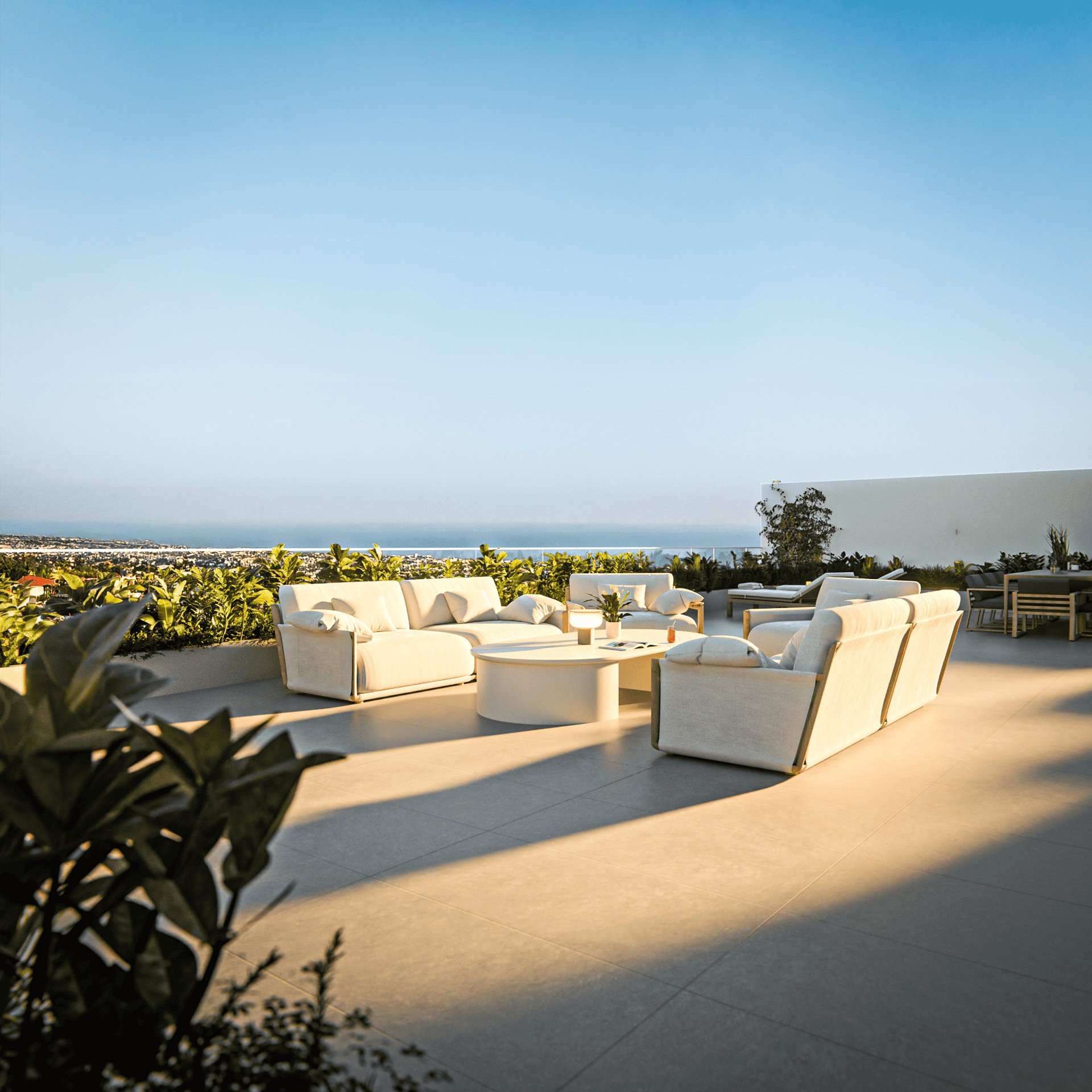 Архитектура сочетает чистые линии, утонченную простоту и вневременную цветовую палитру белого цвета и натуральных бетонных тонов. Это создаёт лёгкий, современный облик, который органично объединяет внутреннее пространство с прибрежным ландшафтом.