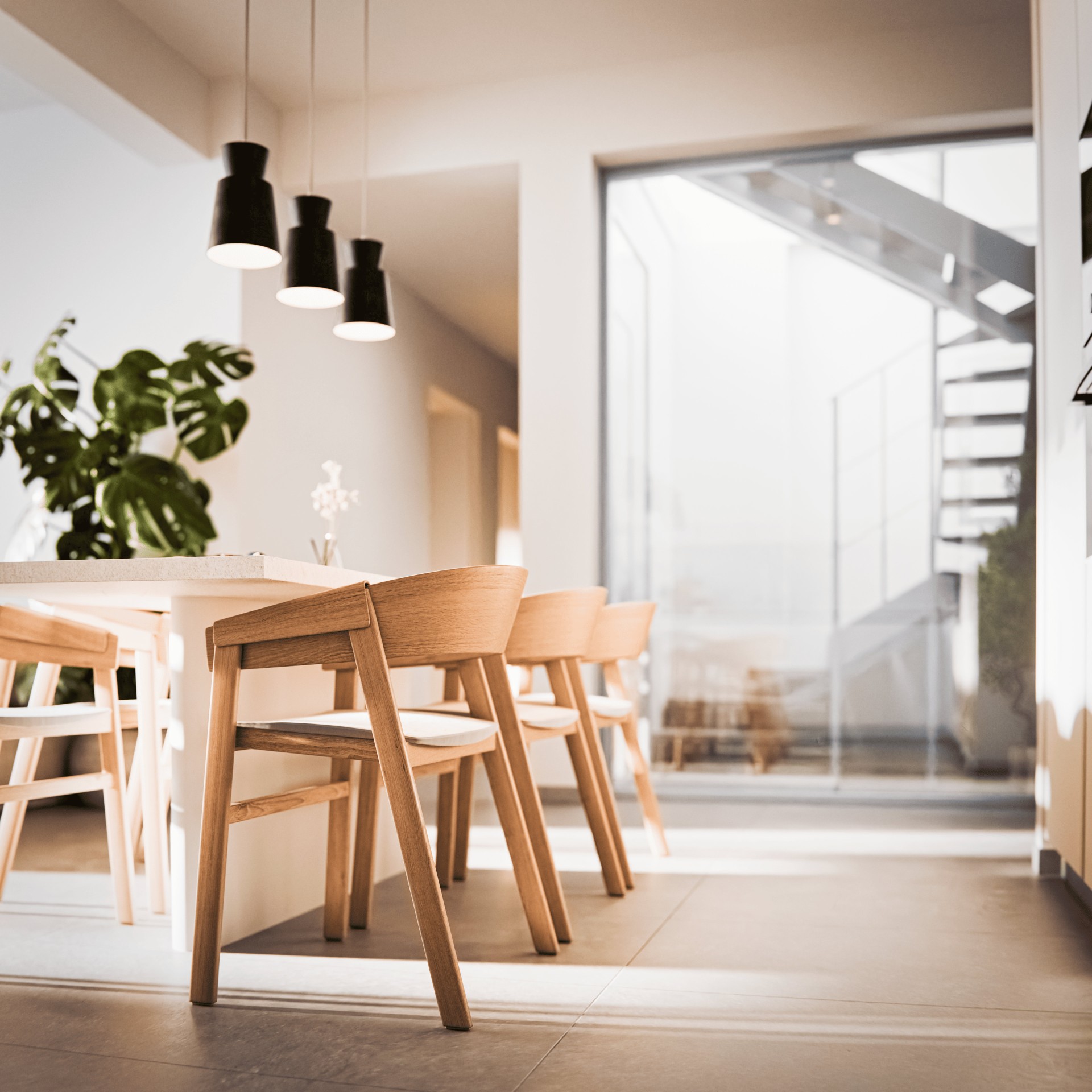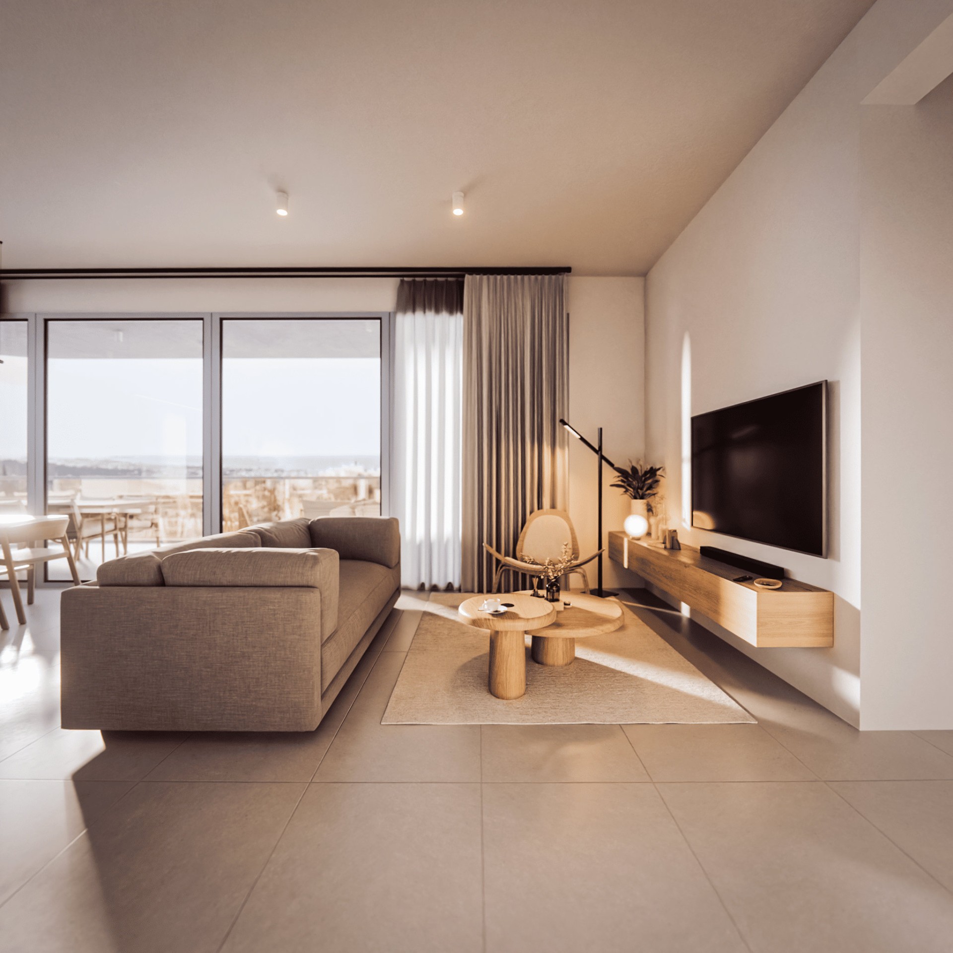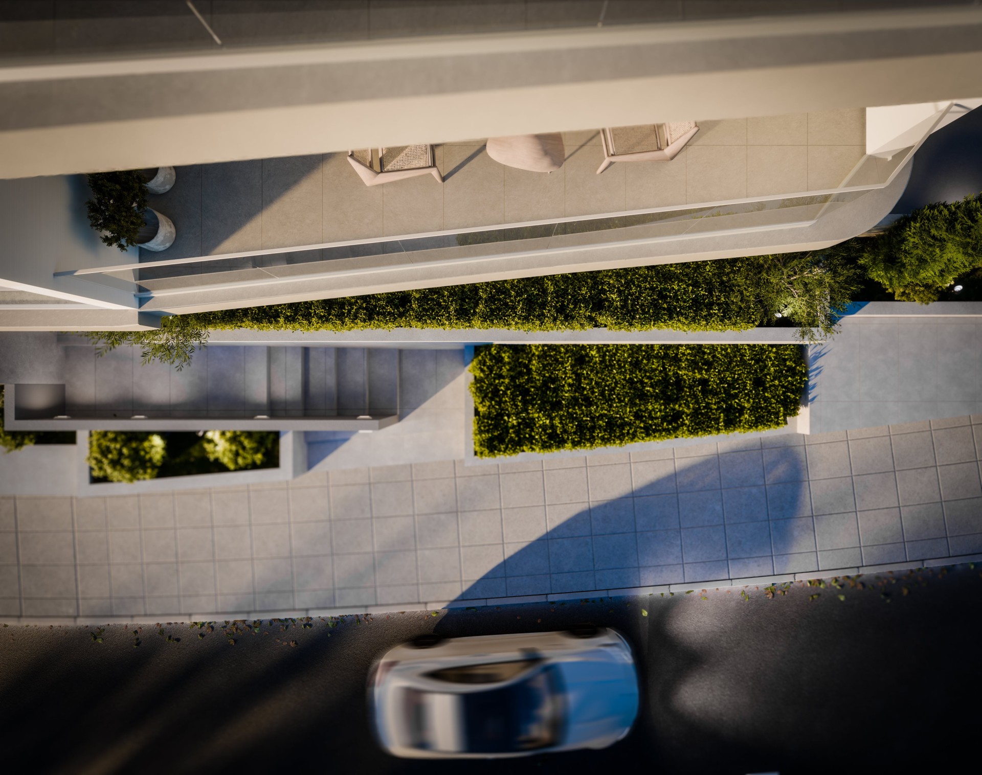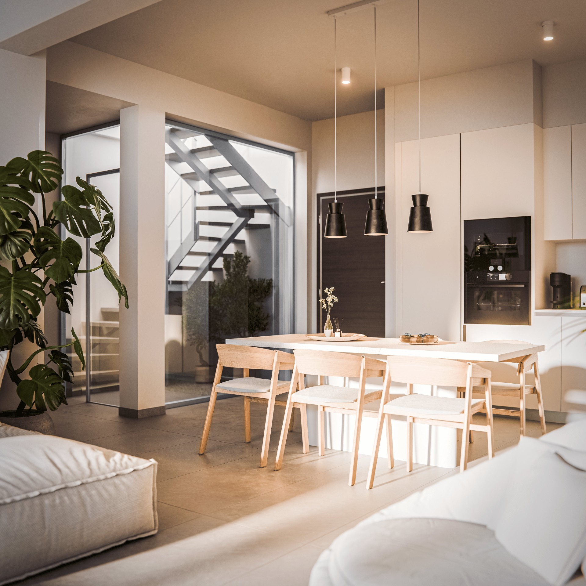 Архитектура сочетает чистые линии, утонченную простоту и вневременную цветовую палитру белого цвета и натуральных бетонных тонов. Это создаёт лёгкий, современный облик, который органично объединяет внутреннее пространство с прибрежным ландшафтом.