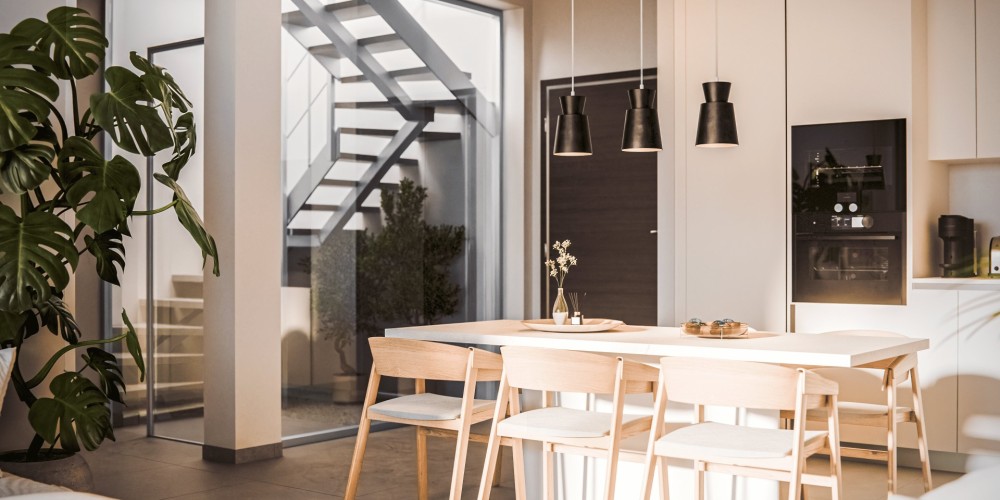 - Современные планировки открытого типа с объединённой зоной гостиной, столовой и кухни