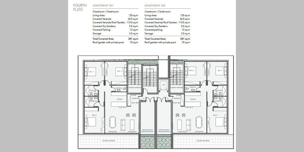 Четырехэтажное здание состоит всего из 11 квартир с прекрасным видом на побережье Пафоса. На первых трех этажах предлагается выбор из трех квартир с двумя спальнями на каждом этаже, а верхний этаж принадлежит для двух пентхаусов с тремя спальнями, каждый из которых имеет доступ к собственной террасе на крыше с частным бассейном. Объект расположен на боковой дороге у главной улицы, ведущей к набережной. Ближайший песчаный пляж в этом районе находится всего в нескольких шагах от здания. Роскошные отели находятся через улицу, рестораны, кафе и водные виды спорта находятся неподалеку, 10-минутная прогулка вдоль моря ведет до старой гавани и средневекового замка. На первом, втором и третьем этажах предлагаются три квартиры с двумя спальнями, которые похожи по размеру, но по разному расположены. Каждая квартира имеет две ванные комнаты, одна из которых находится в главной спальне. Большая гостиная открытой планировки, обеденная зона и кухня, расширенные веранды и окна предлагают комфорт и конфиденциальность. Стеклянные двери веранды от пола до потолка гарантируют, что каждый уголок в каждой квартире будет светлым и воздушным. На четвертом этаже вся территория поделена на трехкомнатные пентхаусы. В главной спальне есть ванная комната, вторая ванная комната делится с двумя другими спальнями и есть дополнительный гостевой туалет. Помимо большой крытой веранды, во всех квартирах есть выход на собственную террасу с бассейном на крыше и зоной для загара и барбекю.