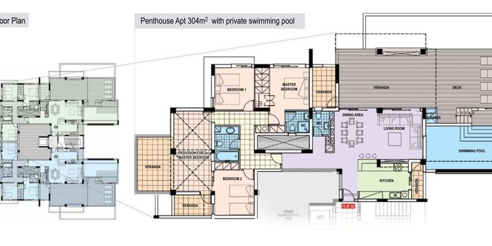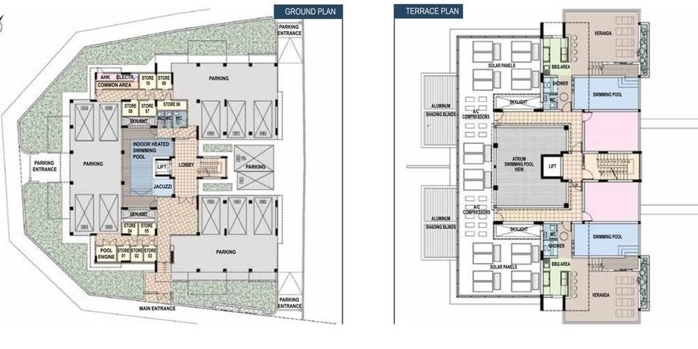 Это жилое здание состоит из 10 просторных квартир. На первом этаже есть парковочные места для каждой квартиры с тремя входами для удобства и складское помещение. Также в здании есть общий крытый бассейн с подогревом и джакузи с кабинами переодеться, туалетами и зоной, где жители могут сидеть, отдыхать и наслаждаться своим свободным временем. Также для жителей устроен стеклянный лифт, из которого поднимаясь или спускаясь можно наблюдать бассейн.