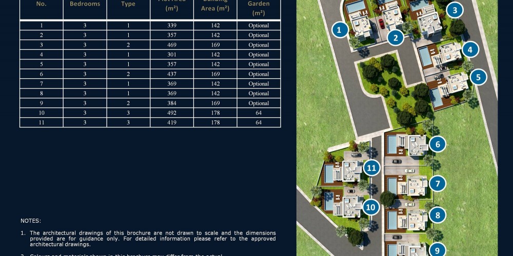 Виллы будут типа закрытого комплекса, состоящим из одиннадцати элегантных домов с тремя спальнями, расположенными на больших участках земли. Виллы доступны в двух размерах, оба имеют одинаковую концепцию современного дизайна, которая сочетает в себе минимализм с чистыми архитектурными линиями, эффективное использование всех пространств и большие окна, с помощью которых интерьер наполняется естественным светом. Эти виллы, спроектированные с мельчайшими деталями, с использованием высококачественных материалов и с широким выбором альтернативных вариантов отделки, являются прекрасным местом для проживания, которое вы можете с гордостью называть своим домом.