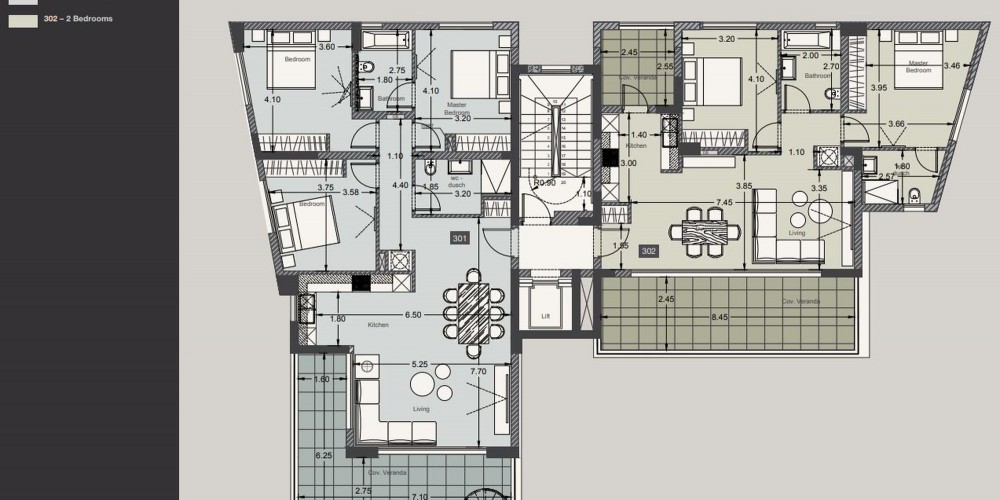 Комплекс состоит из пяти квартир с двумя и тремя спальнями и одного пентхауса с тремя спальнями. Жители будут пользоваться удобствами, такими как общий бассейн и просторная парковка. Паркетные полы, мраморные полы и стены в ванных комнатах, дорогие кухонные шкафы, центральная система кондиционирования VRV и пол с подогревом - это только часть функций, которые будут иметь квартиры. Пентхаус имеет просторный сад на крыше с частным бассейном и прекрасный панорамный вид на город.