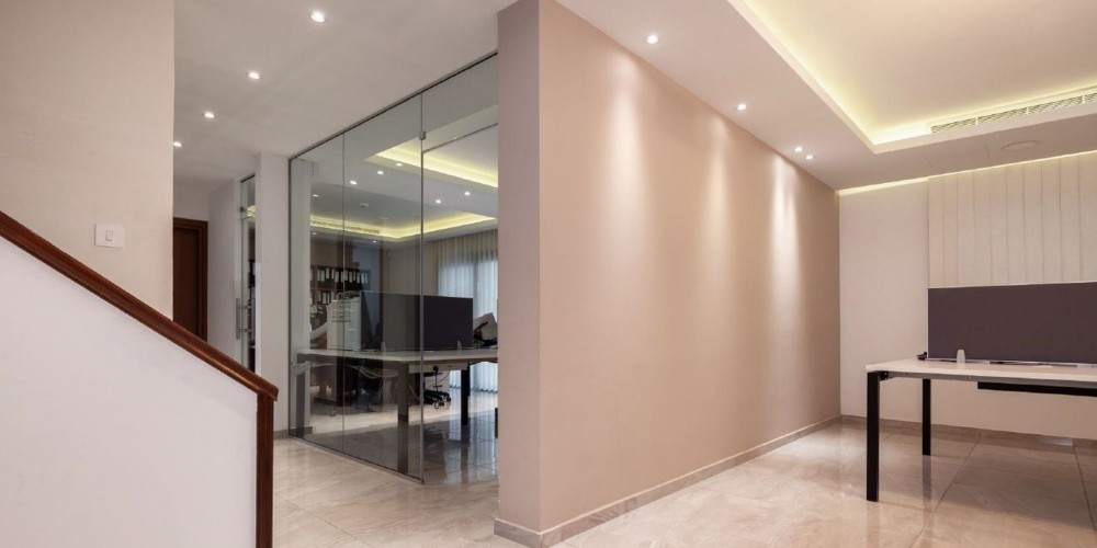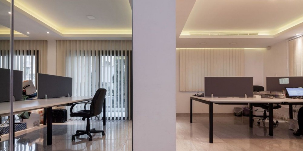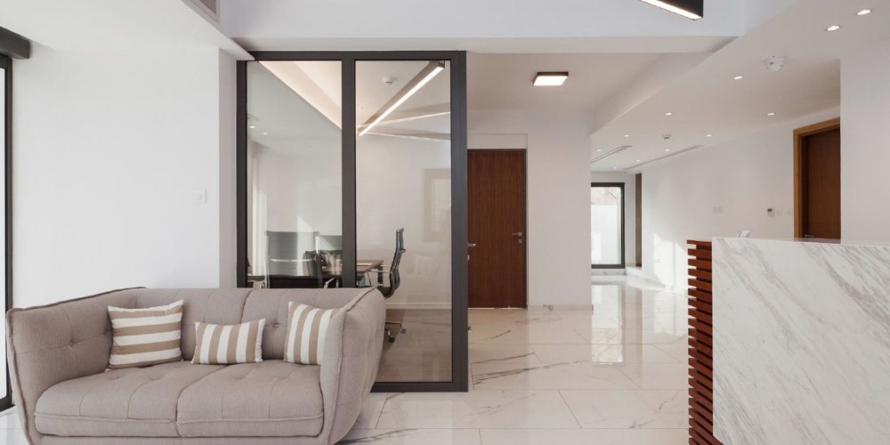 Мебель включает новые столы, кожаные кресла, виниловые жалюзи высокого качества и итальянские диваны.
