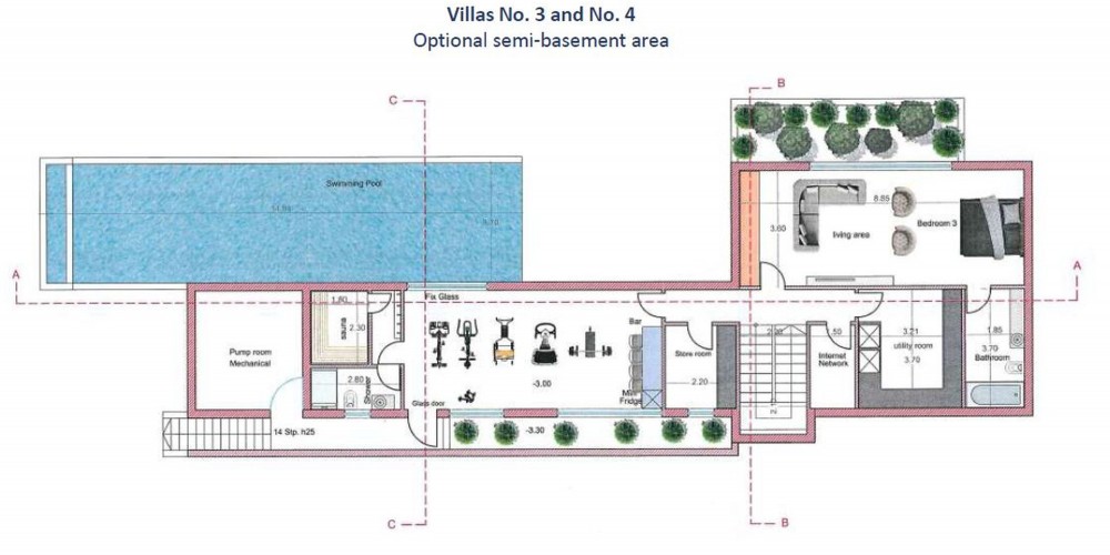 Дополнительная полуподвальная зона может быть спроектирована в соответствии с требованиями клиента в дополнительные комнаты, такие как спальня с ванной комнатой, тренажерный зал, кинотеатр, подсобное помещение, бар, винный погреб, джакузи, сауну, кладовую и т. д.