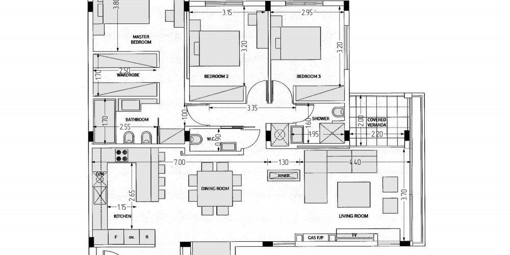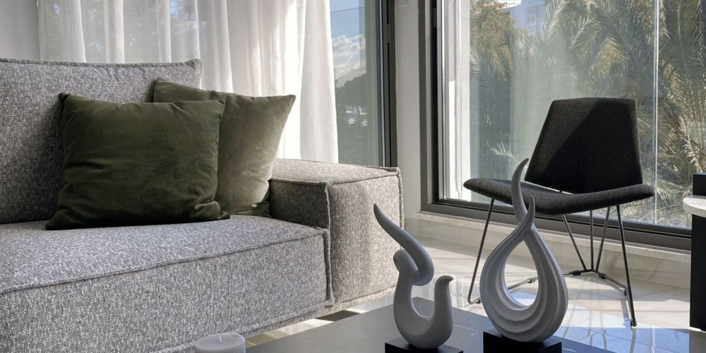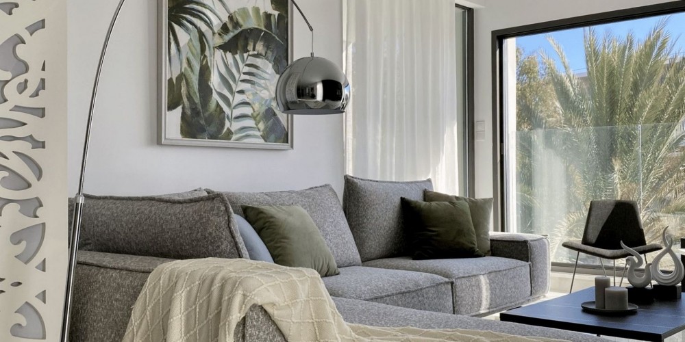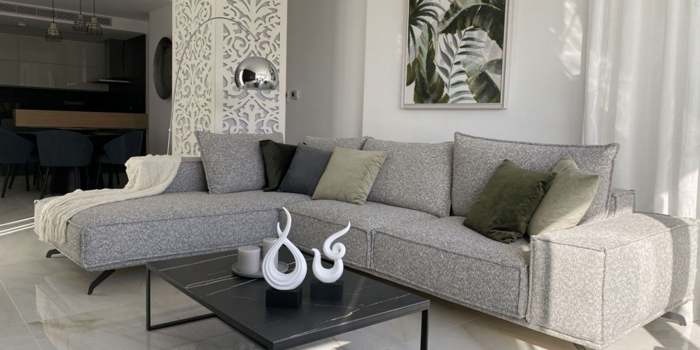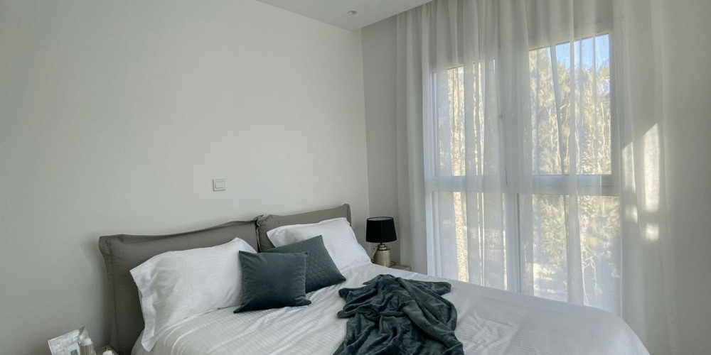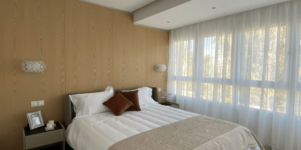 Квартира расположена на третьем этаже в закрытом комплексе, из двух жилых блоков. Квартира может похвастаться видами на море и пляж с угловым видом на сезонную реку, текущую в море. Комплекс окружен ландшафтными садами.