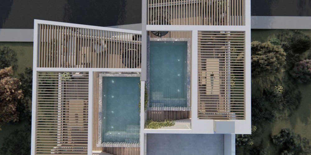 Здание состоит из 3 этажей и всего 10 квартир с садами на крыше и частными бассейнами на верхнем этаже. Уникальный дизайн обеспечивает уединение для его жителей.