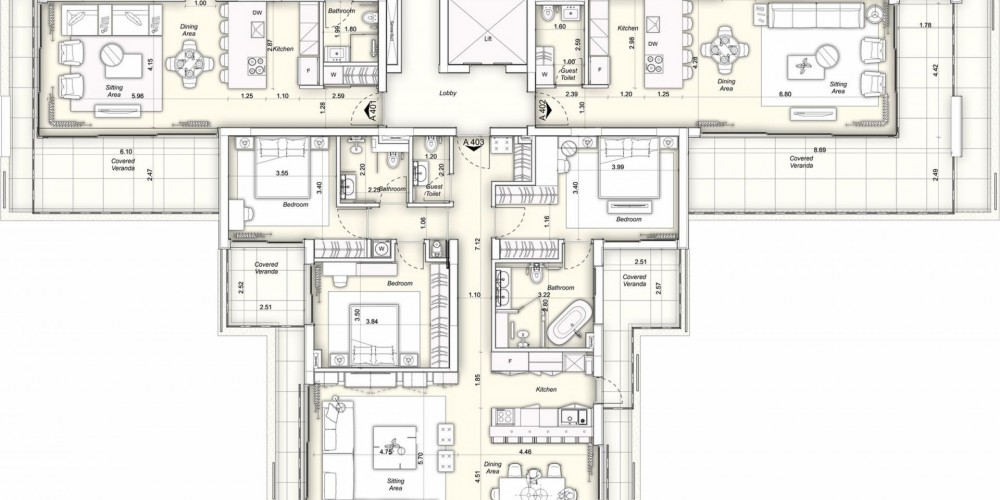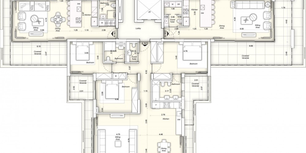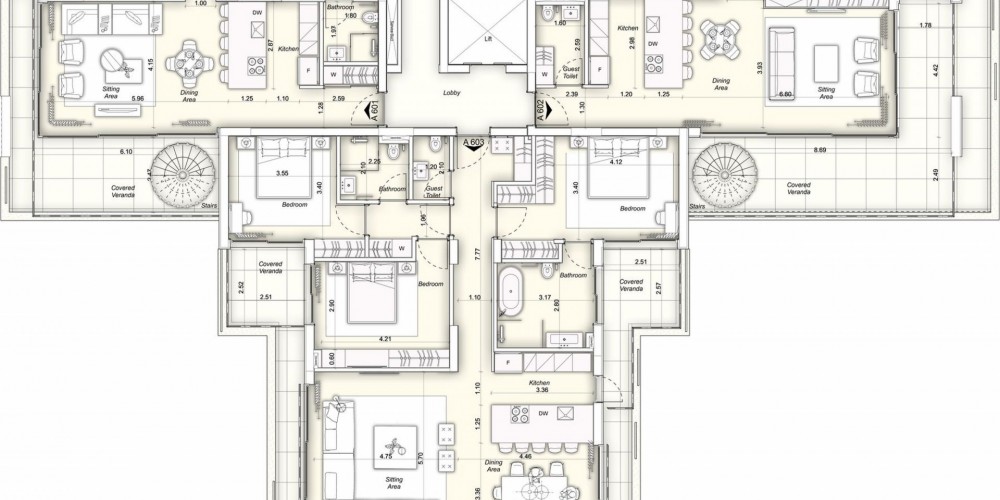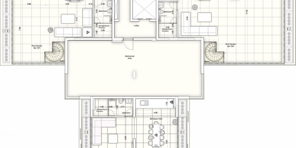 Здание комплекса включает в себя 9 уровней: подземный паркинг, просторное лобби и шесть этажей с квартирами и роскошным садом на крыше, принадлежащие пентхаусам 6-го этажа. В комплексе 20 квартир, состоящих из 1, 2 или 3 спален с отдельными ванными комнатами. В каждой квартире есть просторная гостиная с кухней, большая крытая веранда с видом на море.