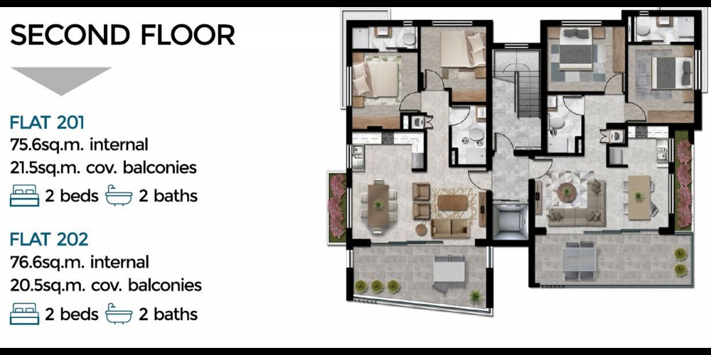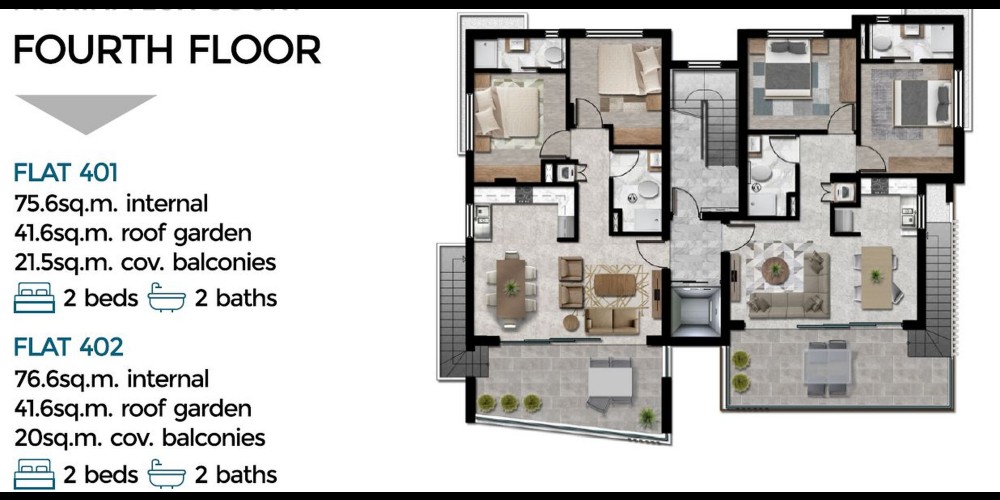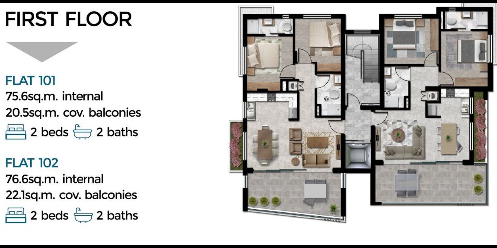 Расположенный недалеко от порта Ларнаки, проект состоит из четырех этажей по 2 квартиры с двумя спальнями на каждом этаже. На пятом этаже также есть сад на крыше. Дизайн современный, минималистичный, использованы энергосберегающие строительные материалы.
