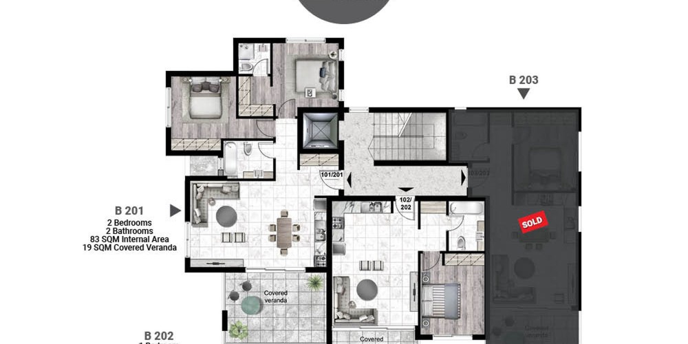 Проект состоит из 2 блоков и предлагает выбор квартир с 1 и 2 спальнями, а также пентхаусы с 3 спальнями и большими террасами.