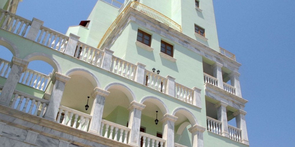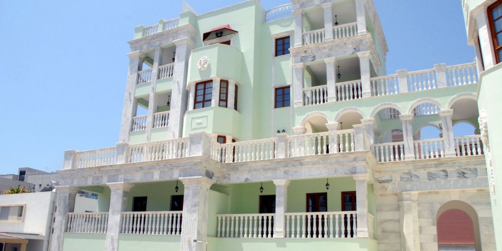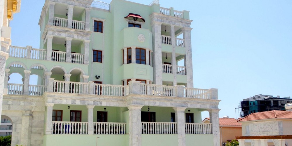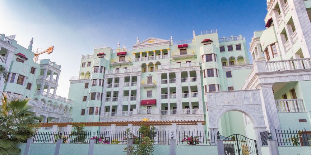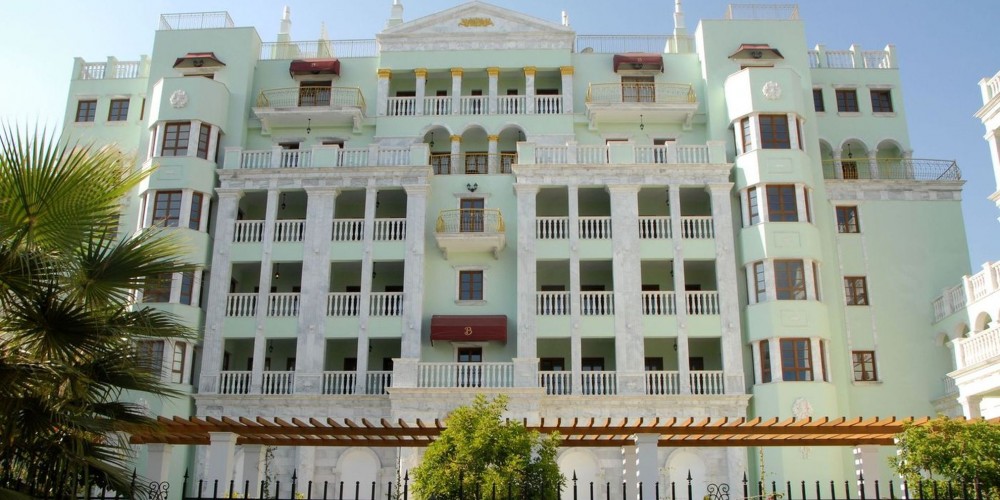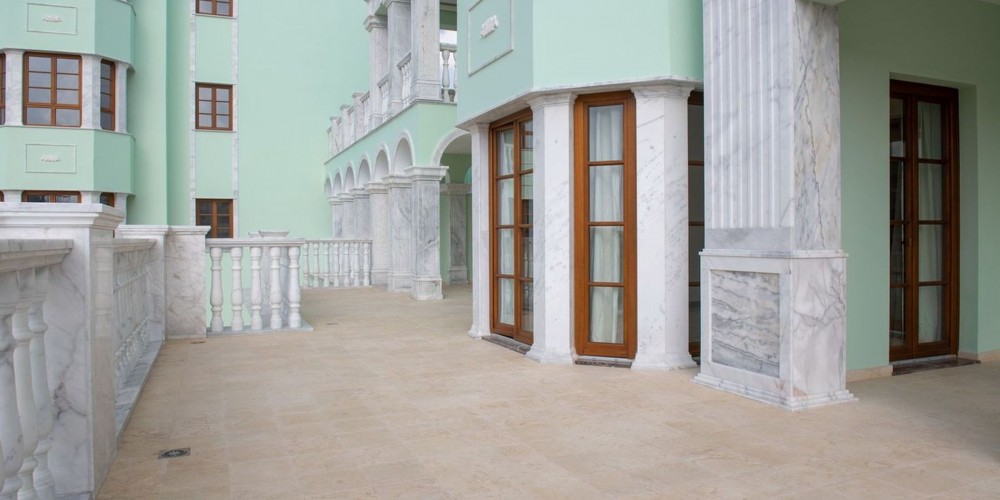 Комплекс выполнен в классическом стиле европейской архитектуры. Фасад богато украшен колоннами с различными капителями (коринфским, ионическим, дорическим), баллюстрадами, оконными и дверными обрамлениями, декоративными элементами из белого мрамора и натурального камня. Открытые балконы огорожены ручной работы перилами из кованого железа и защищены от солнца дорогими маркизами. Боковые опоры балконов выполнены в классическом стиле и являются украшением всего здания. Дополнительную красоту зданию придают эркеры и массивный фронтон с центральной колоннадой.