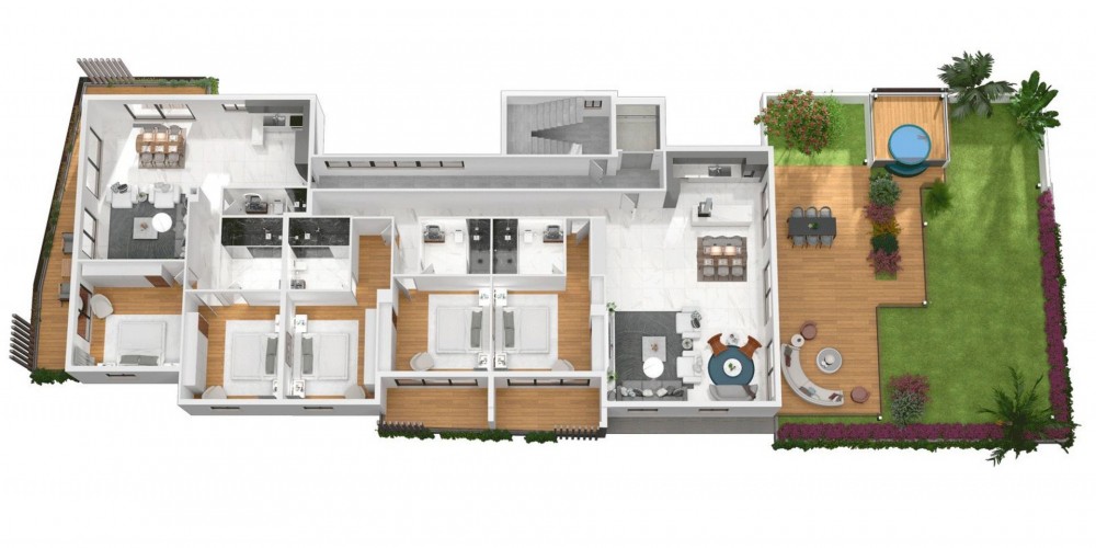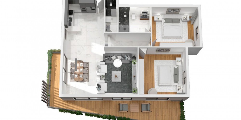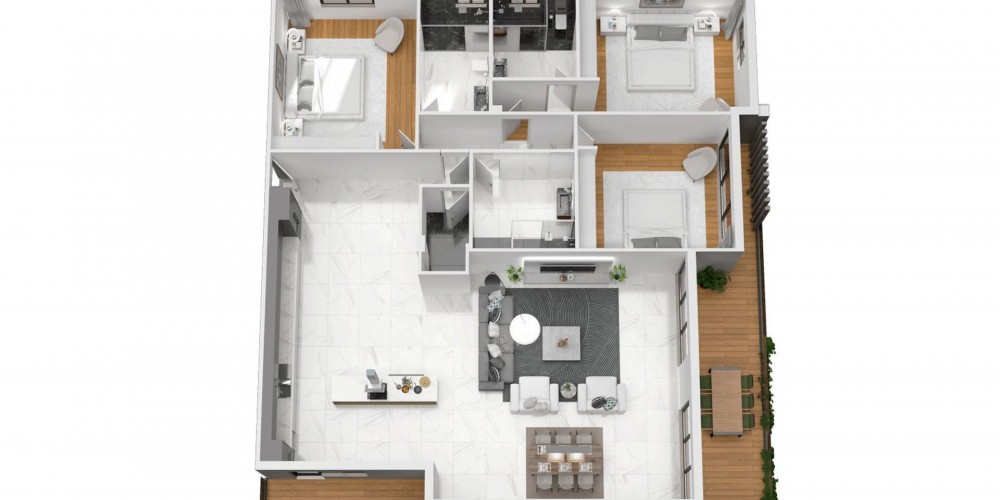 Комплекс состоит из 1, 2, 3-х комнатных квартир, включая пентхаус с большой открытой верандой. В удобства так же вкючены «умные» технологии, крытые парковки, кладовые, общий бассейн и джакузи на крыше.