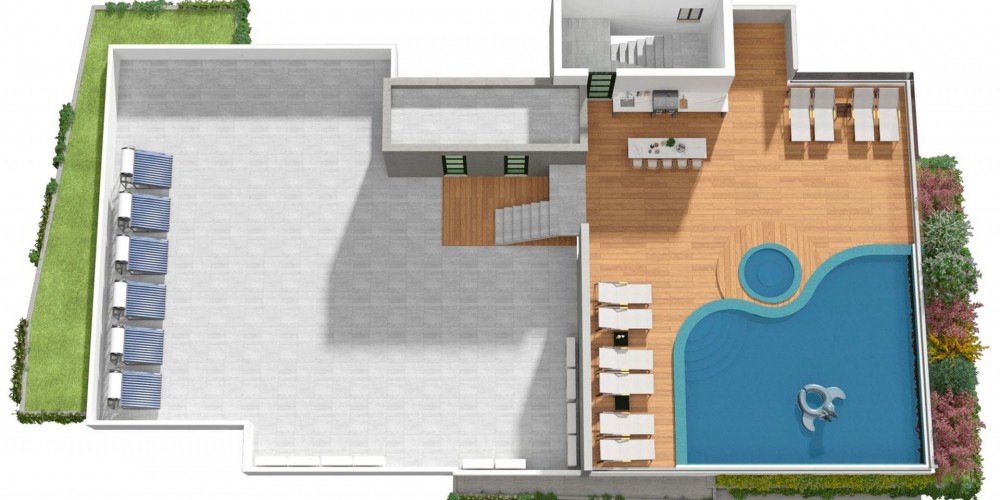 Расположение проекта предлагает вид на море из общего бассейна и джакузи, расположенных на крыше здания.