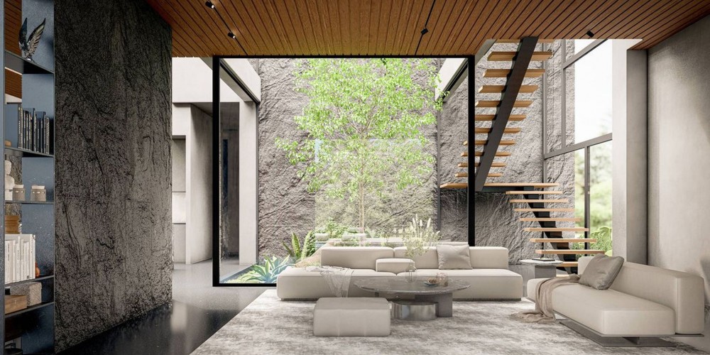 На верхнем этаже две просторные спальни с ванными комнатами с видами на сад и бассейн. Есть также полукрытые веранды. В коридоре наверху можно попасть в спальни и в атриум, состоящий из уникального ландшафта и редкой экзотической фауны.