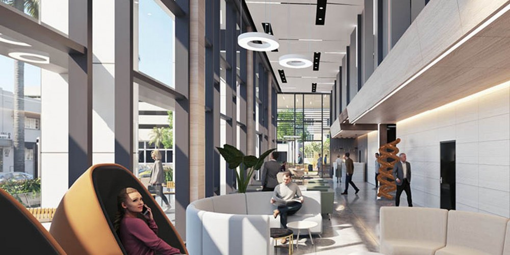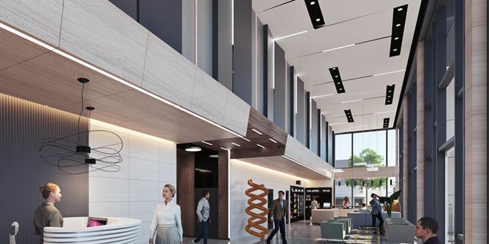 Есть двойной вестибюль, а остекление во всю высоту каждого этажа создает залитое светом рабочее пространство, котоое придает комфорт и в то же время открывает вид на весь город.