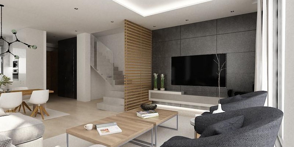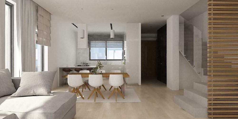 Проект состоит из 2-х этажных домов с кухней/гостиной открытой планировки и гостевым туалетом на первом этаже и 3-х спален с ванными комнатами (главная с гардеробной) и прачечной на первом этаже. Дома будут иметь крытую парковку и сад, в котором можно добавить бассейн (по желанию).