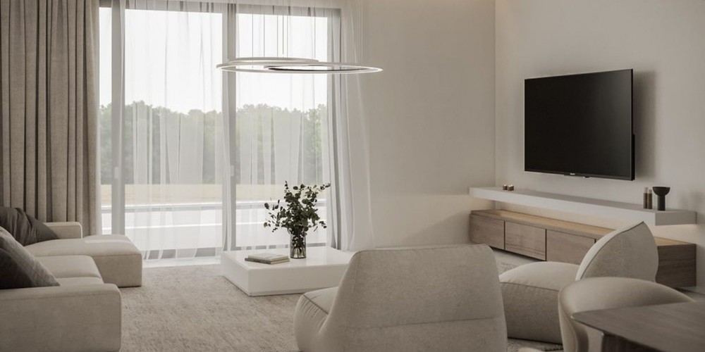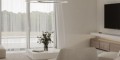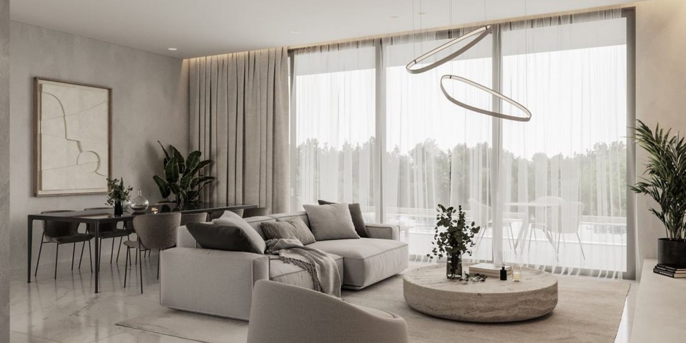 Большие окна пропускают свет в гостиную с нейтральными тонами. Просторная планировка была тщательно спроектирована, чтобы обеспечить максимальное пространство с тремя спальнями, которые охлаждаются летом с помощью системы VRV и обогреваются зимой с помощью подогрева пола.