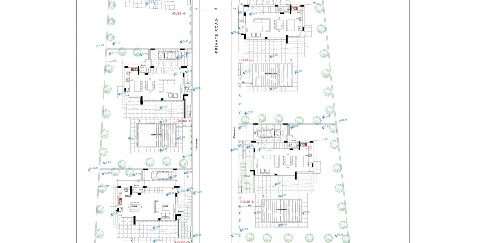 Проект состоит из 2 бунгало и 7 отдельно стоящих домов. Два бунгало и четыре отдельных дома имеют бассейн. Все дома имеют южную ориентацию.