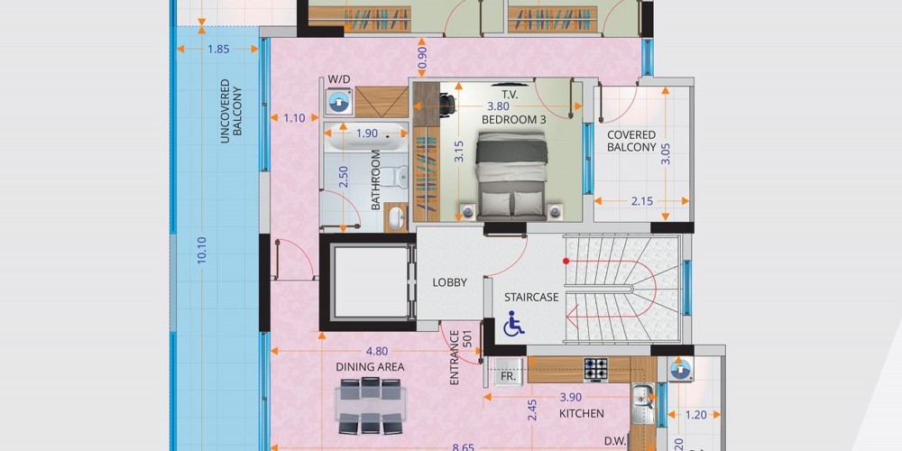 В проекте будет по 2 квартиры на каждом этаже: одна квартира с 1 спальней и одна с 2 спальнями, все с просторными жилыми помещениями. На пятом этаже будет квартира на весь этаж с 3 спальнями и 3 ванными комнатами, а также частный сад на крыше на шестом этаже с видом на город. Каждой квартире будет выделено 1 парковочное место и большая кладовая.
