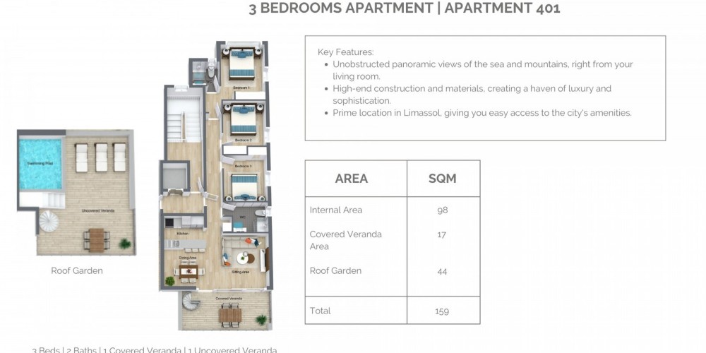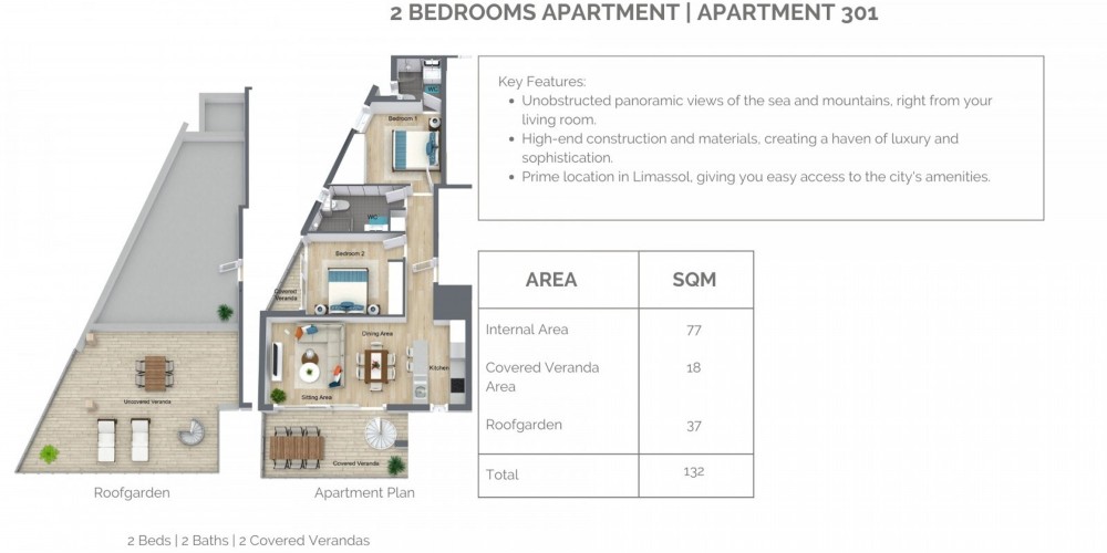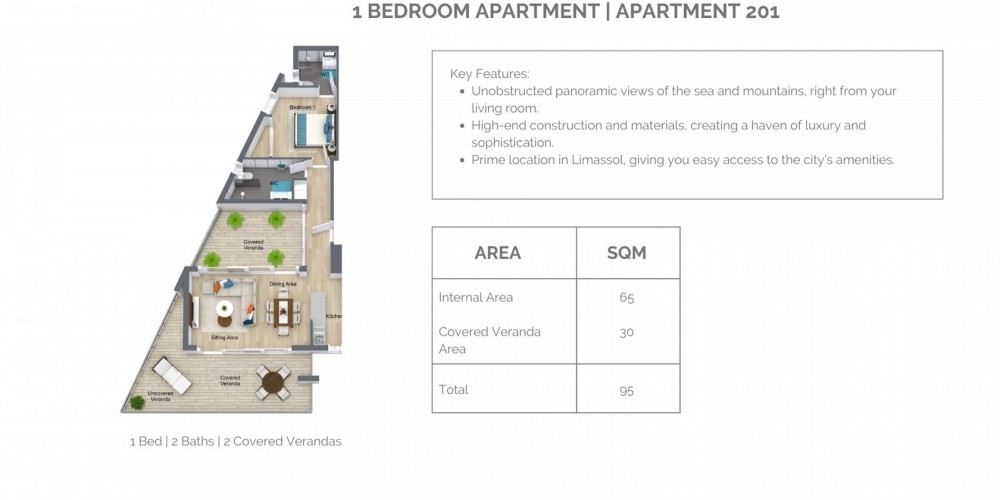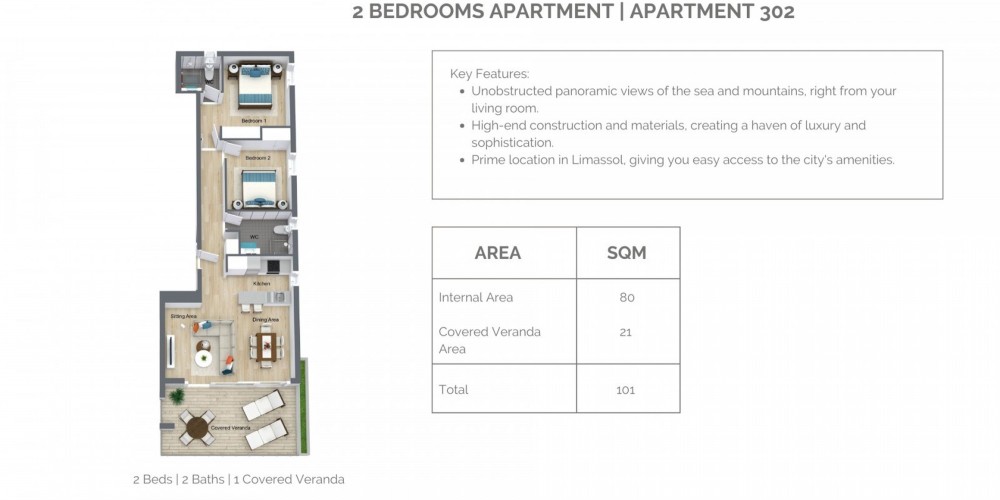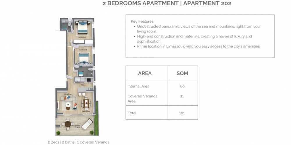 Проект расположен в самом сердце Лимассола. Это жилое здание состоит из четырех этажей с квартирами с 1 и 2 спальнями, а также пентхауса с тремя спальнями на четвертом этаже.