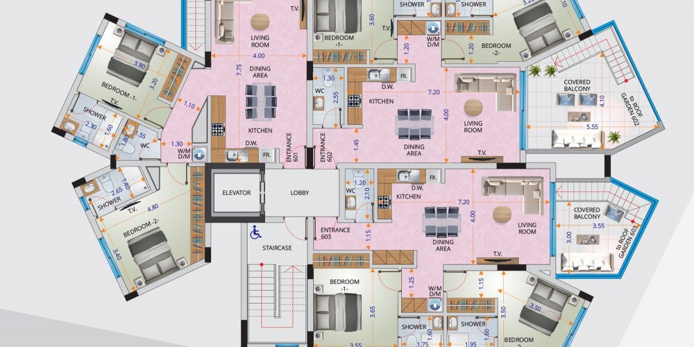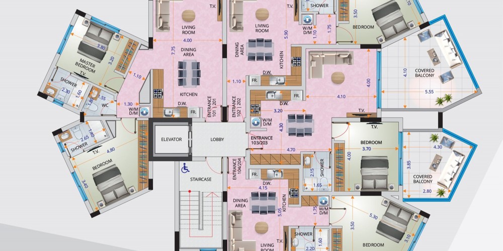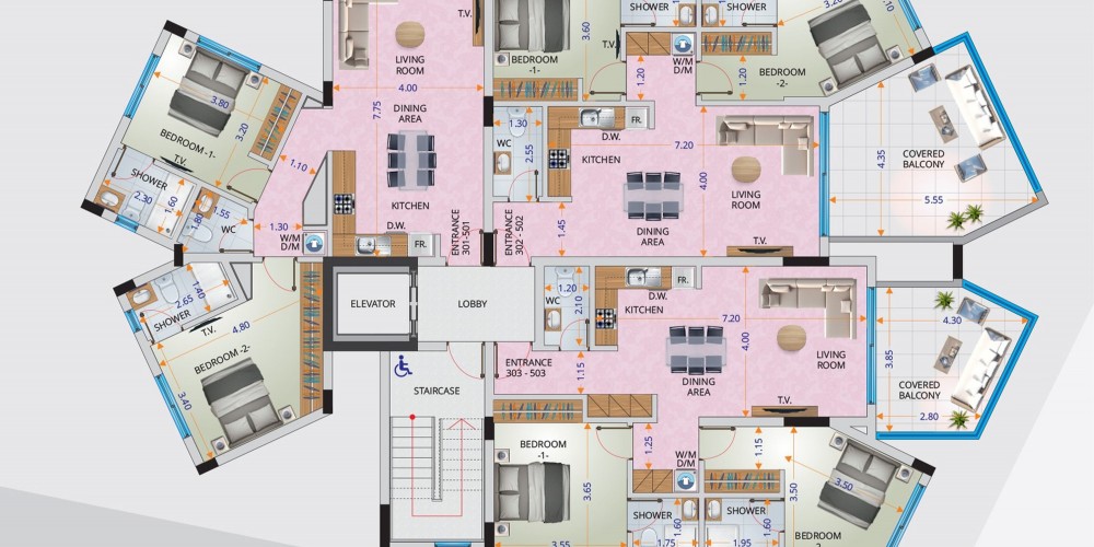 Все квартиры спроектированы так, чтобы иметь большие жилые площади и балконы, а также просторные спальни, включая ванные комнаты с душевыми и гардеробные.