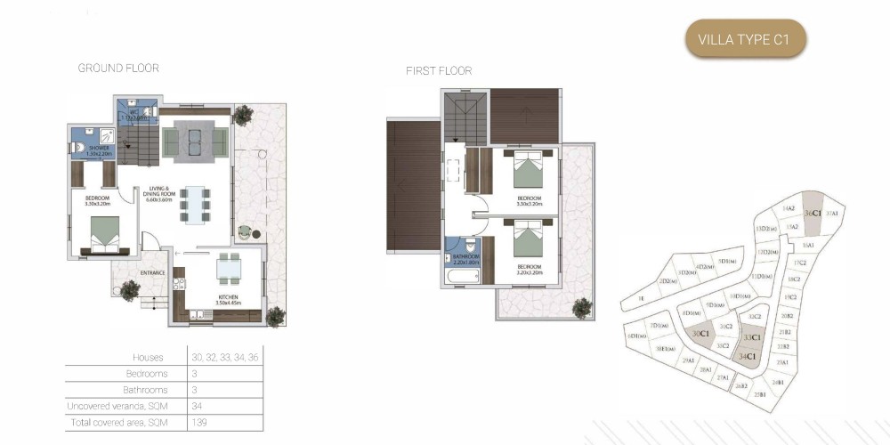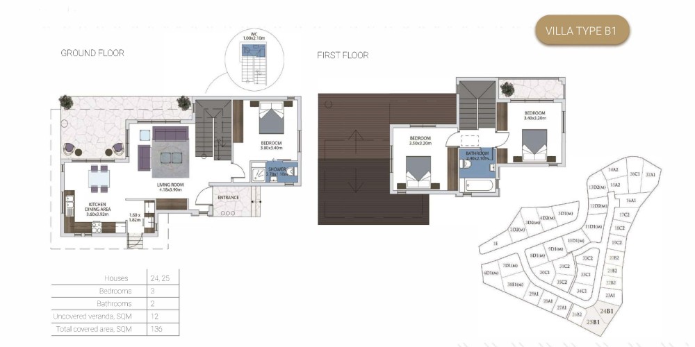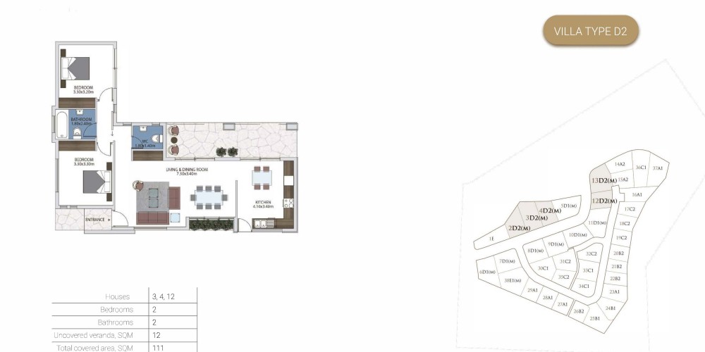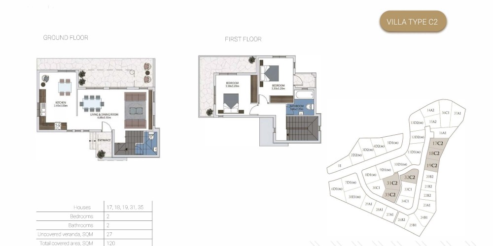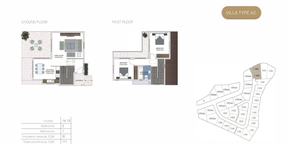 Проект состоит из 25 вилл с двумя и тремя спальнями, а также 13 бунгало с двумя и тремя спальнями. Во всех апартаментах есть гостиная и кухня открытой планировки с частным бассейном, окруженным просторным внутренним двориком и садом.