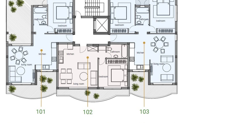 Квартиры с одной и двумя спальнями различаются по размеру, что позволяет клиентам выбирать. Небольшое количество квартир в каждом блоке (A и Б) создает среди жильцов чувство общности, а также обеспечивает конфиденциальность и безопасность.