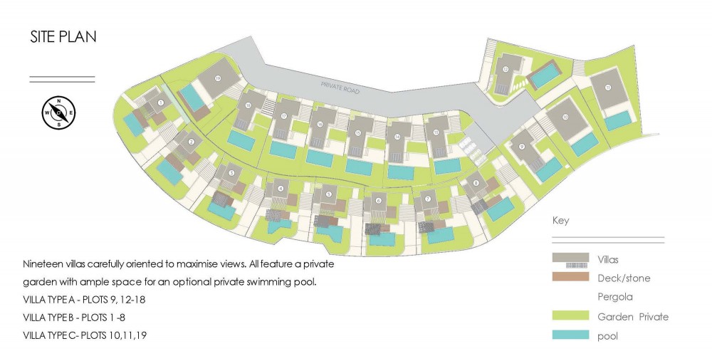 Комплекс состоит из 19 вилл, тщательно ориентированных так, чтобы обеспечить максимальный обзор. Все они имеют частный сад с достаточным пространством для частного бассейна. Виллы доступны в трех стилях, каждый из которых просторный и открытый, с большими окнами.