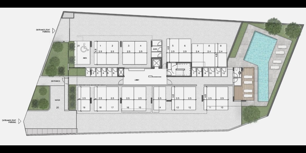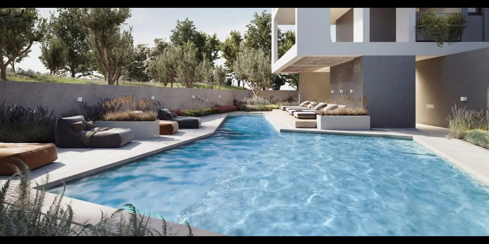Расслабьтесь и наслаждайтесь жизнью на свежем воздухе у общего бассейна, окруженного пышной зеленью.
