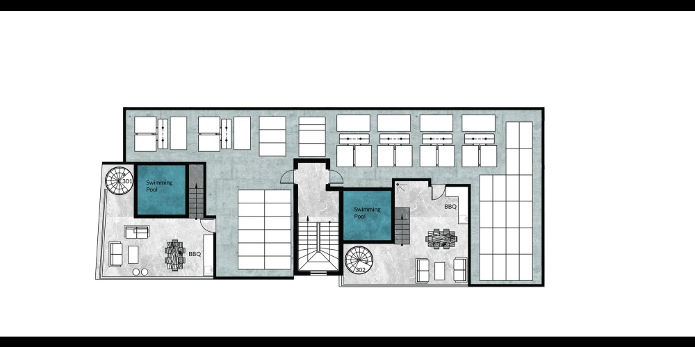 Квартиры на 3 этаже имеют собственные сады на крыше и бассейны.