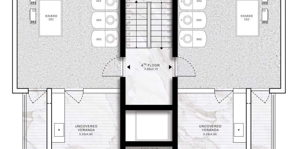 На каждом этаже расположены две квартиры, каждая с открытой гостиной и двумя спальнями, ванной комнатой и гостевым туалетом.