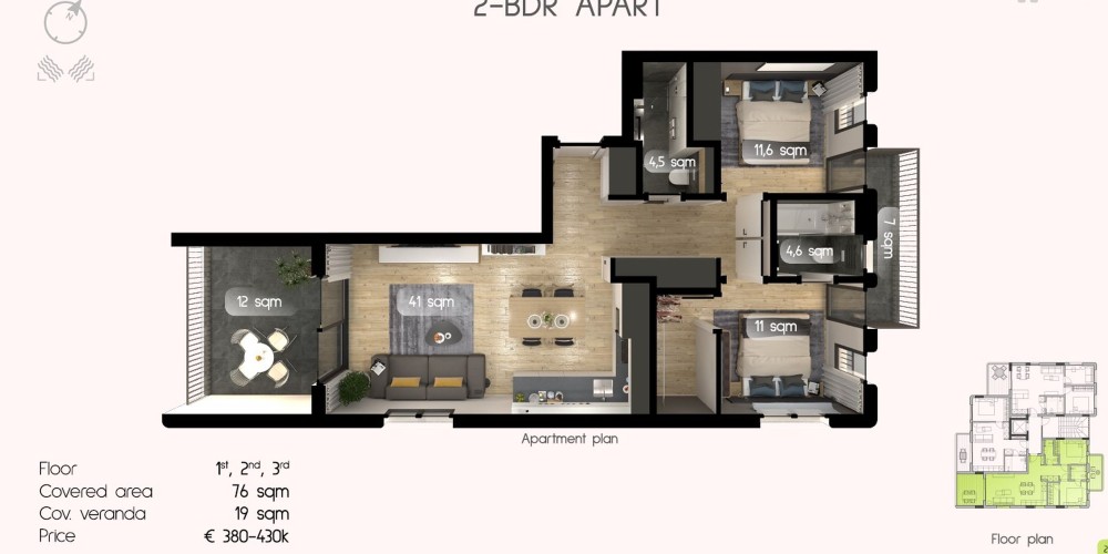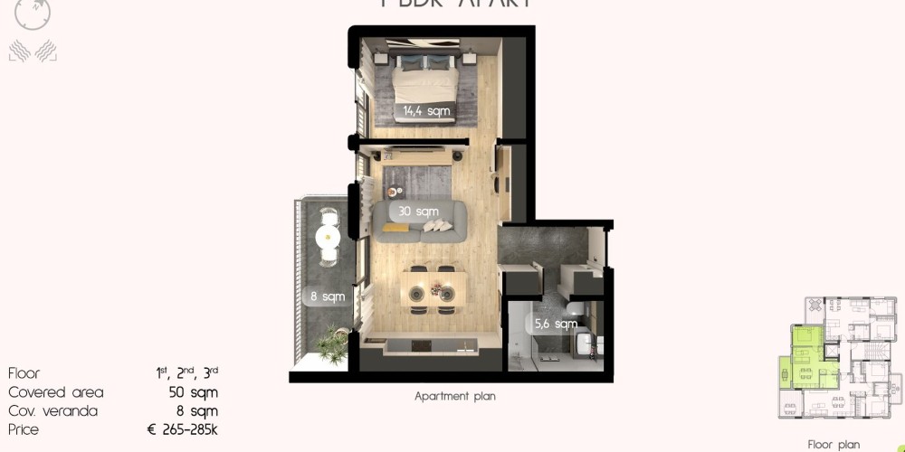 Это жилое здание состоит из 1 и 2-спальных квартир, все построены из качественных материалов и имеют современный дизайн во всех общих зонах. Квартиры, начиная со 2-го этажа, будут иметь вид на море, каждой квартире будет выделена кладовая, а также парковочное место.