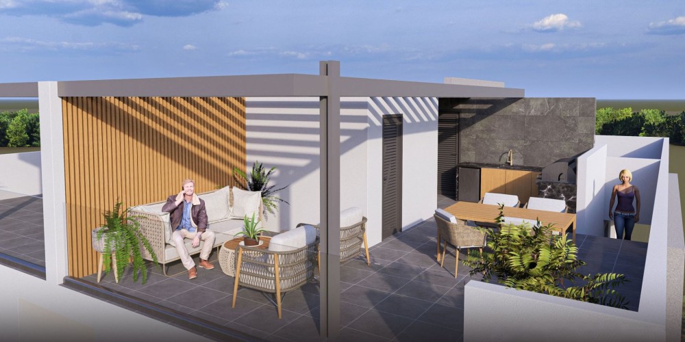 Проект может похвастаться восемью просторными квартирами с 2 спальнями. Квартиры на 4 этаже имеют большие крытые балконы, а также две комнаты на крыше с тремя ванными комнатами, эксклюзивными для владельцев, а также большой бар и зону барбекю на крыше с садом и панорамным видом. Каждой квартире выделено парковочное место и кладовая.