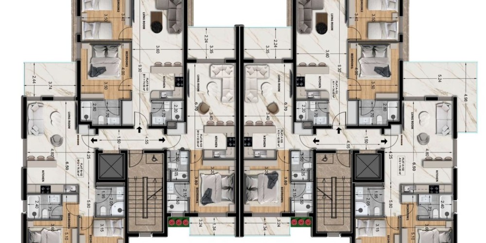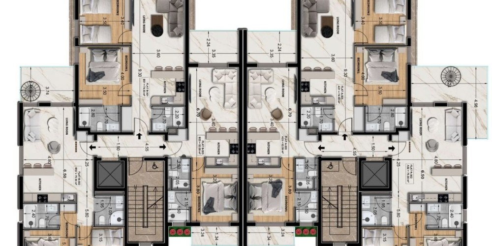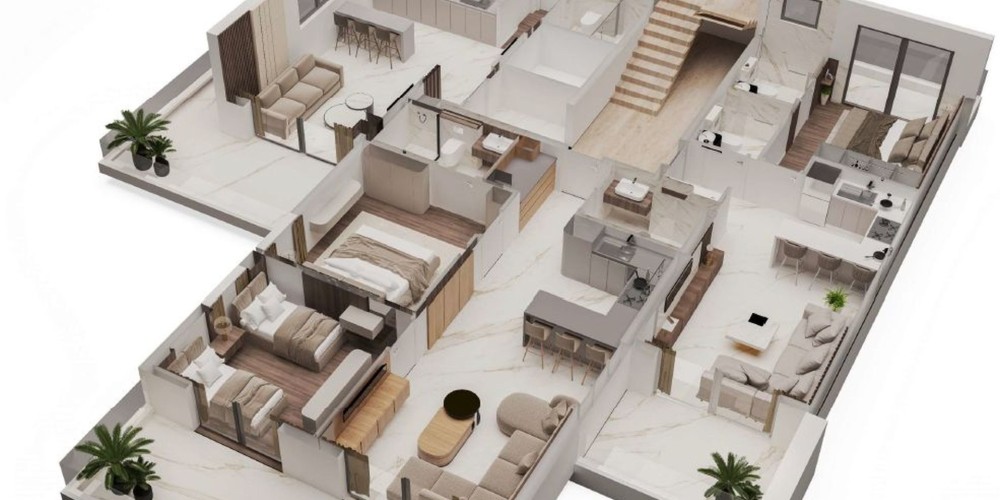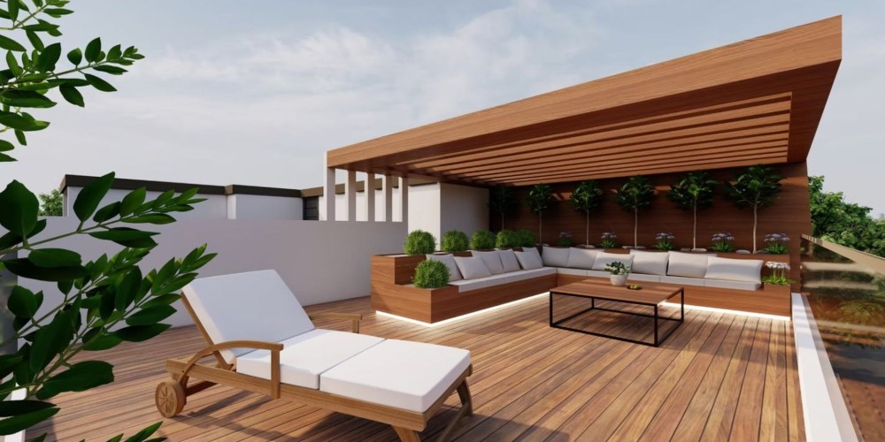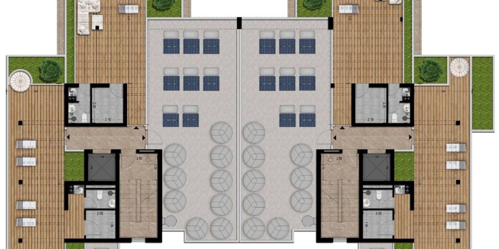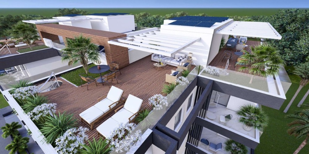Каждый блок включает две квартиры с садом на крыше, сочетающие просторные интерьеры с собственными открытыми террасами. Все квартиры будут иметь отдельную кладовую и парковочное место. Кроме того, будут доступны два гостевых парковочных места.