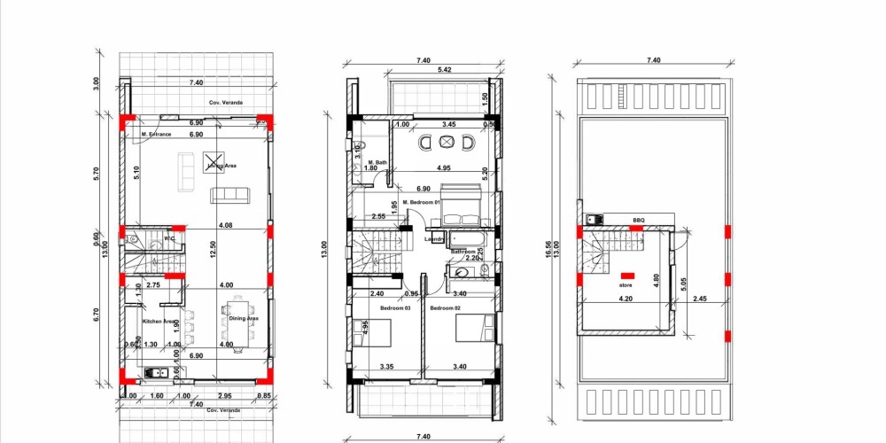 В домах будет 3 спальни (с возможностью иметь 4 спальни), подвесной потолок, подогрев пола, сигнализация, электрические ворота. Бассейн является опциональным (за дополнительную плату).