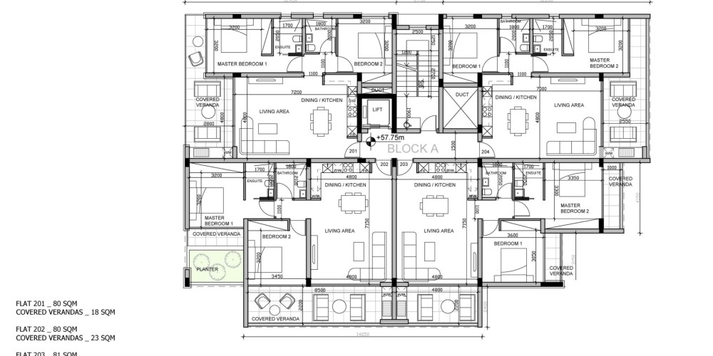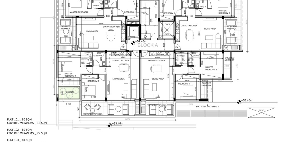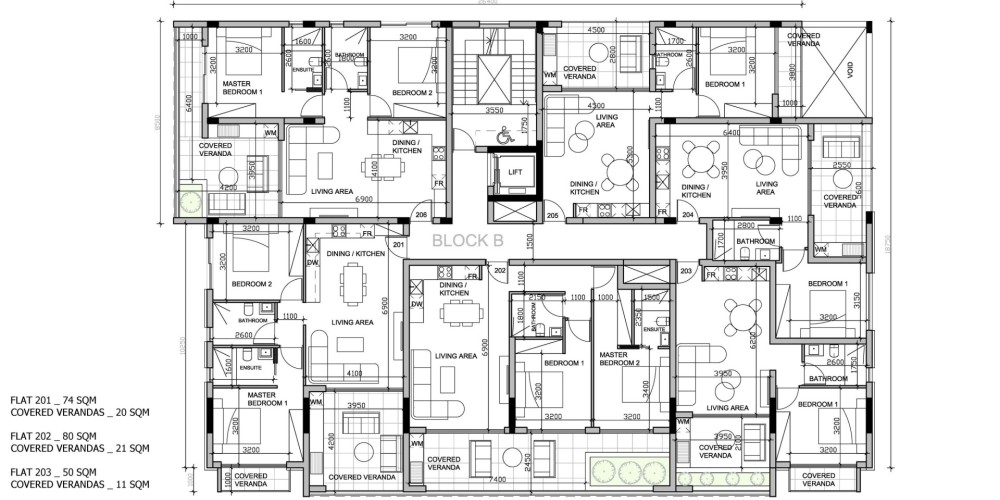 Блок А предлагает 12 просторных квартир с 2 спальнями, а блок В — квартиры с 1, 2 и 3 спальнями.