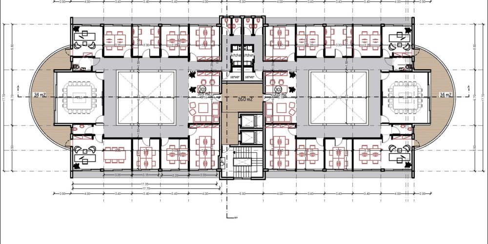 Половина каждого этажа занимает офисные помещения с крытой верандой, а также просторными, полностью оборудованными конференц-залами.