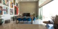 В гостиной высокие потолки, а раздвижные окна полностью открываются, создавая ощущение одновременного пребывания в помещении и на открытом воздухе.