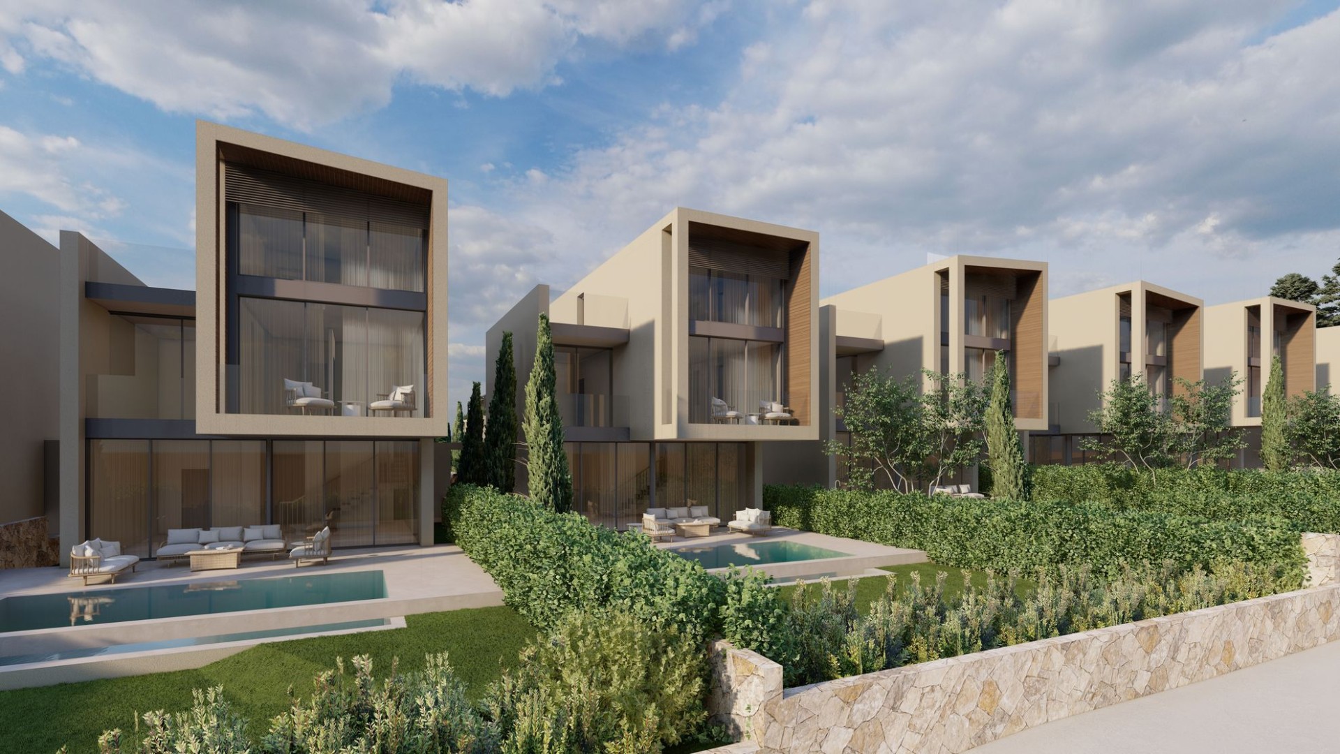 Два многоквартирных здания и шестнадцать вилл в жилом комплексе, окруженный деревьями и открытыми пространствами. Комплекс расположен недалеко от города и моря.
